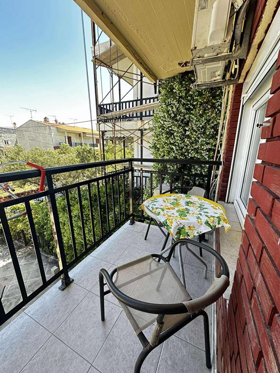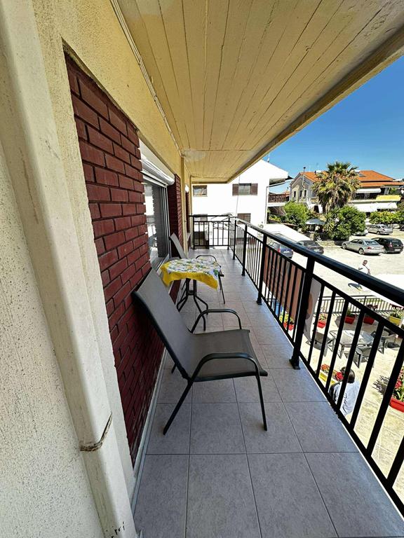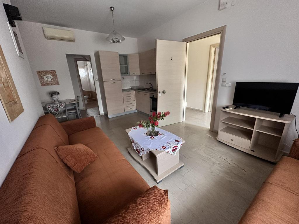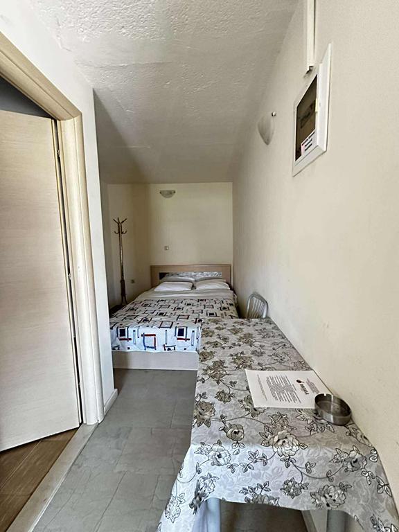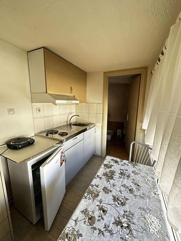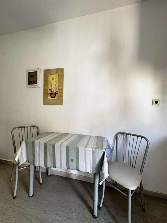 Апартман број 1 (1/4+2) – високо приземје. Простран реновиран апартман со брачен кревет во спална соба, две софи на извлекување во дневна соба споена со кујна. Кујната е голема и комплетно опремена со голем електричен шпорет со рерна, голем фрижидер, маса со столови, клима уред и телевизор. Апартманот има сопствен тоалет со туш. Од кујна се излегува на тераса и истата е опремена со маса и столови.