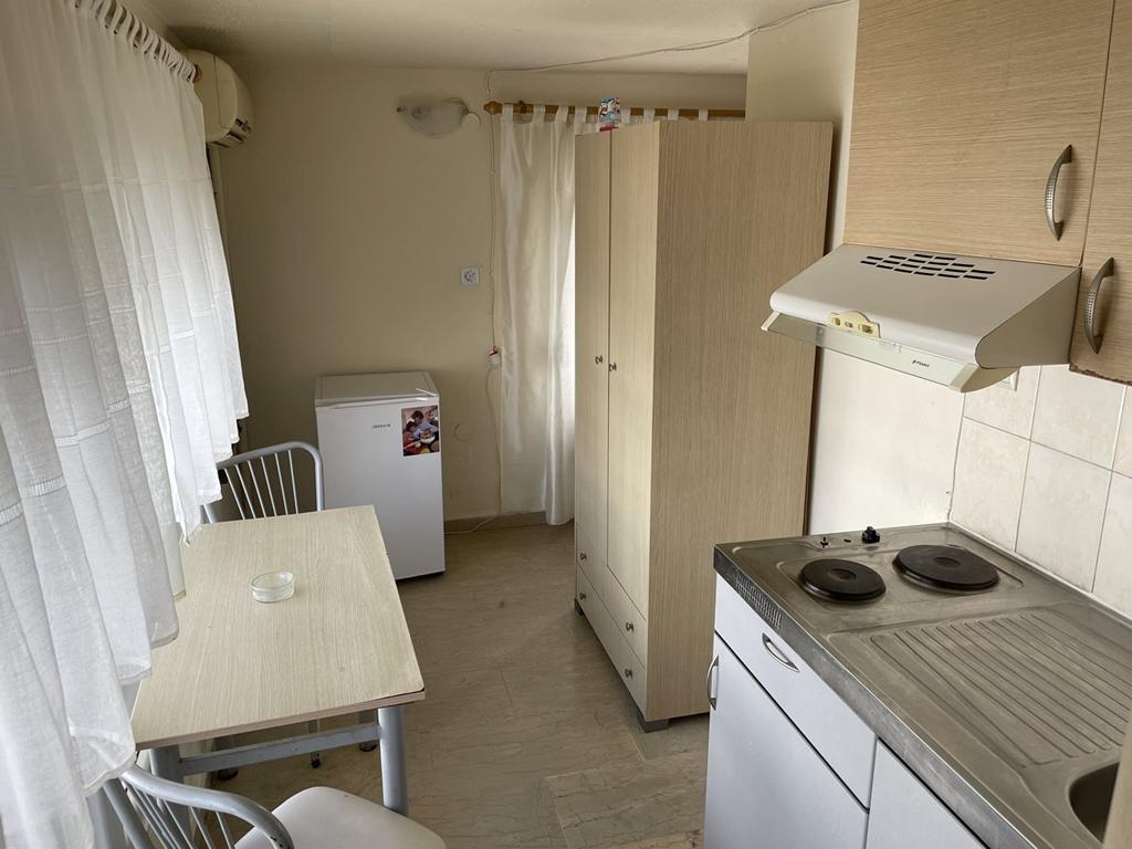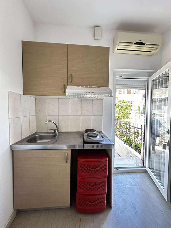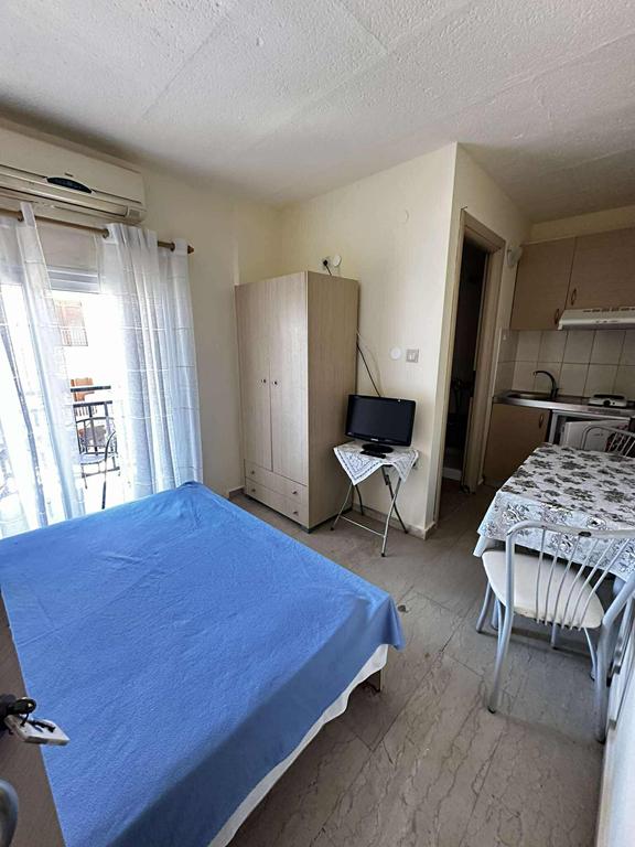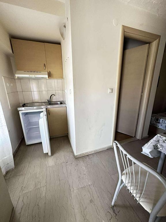 Студио број 3 (1/2) – прв кат. Потесно студио кое располага со еден брачен кревет и мала комплетно опремена кујна (кујнски инвентар, решо и мал фрижидер), клима уред, ТВ и сопствен тоалет со туш. Од студиото се излегува на тераса со поглед позади кон дворот, која е опремена со маса и столови.