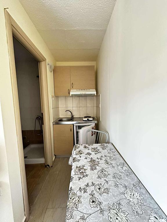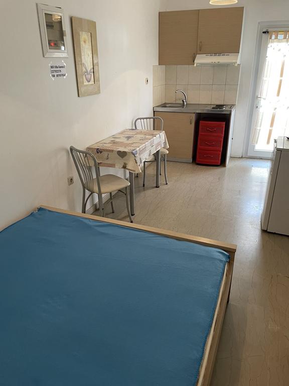 Студио број 6 (1/2) – високо приземје. Студиото е одвоено со сопствен влез и располага со еден брачен кревет и мала комплетно опремена кујна (кујнски инвентар, решо и мал фрижидер), клима уред, ТВ и сопствен тоалет со туш. Од студиото се излегува во сопствено заградено дворче кое располага со маса и столови.