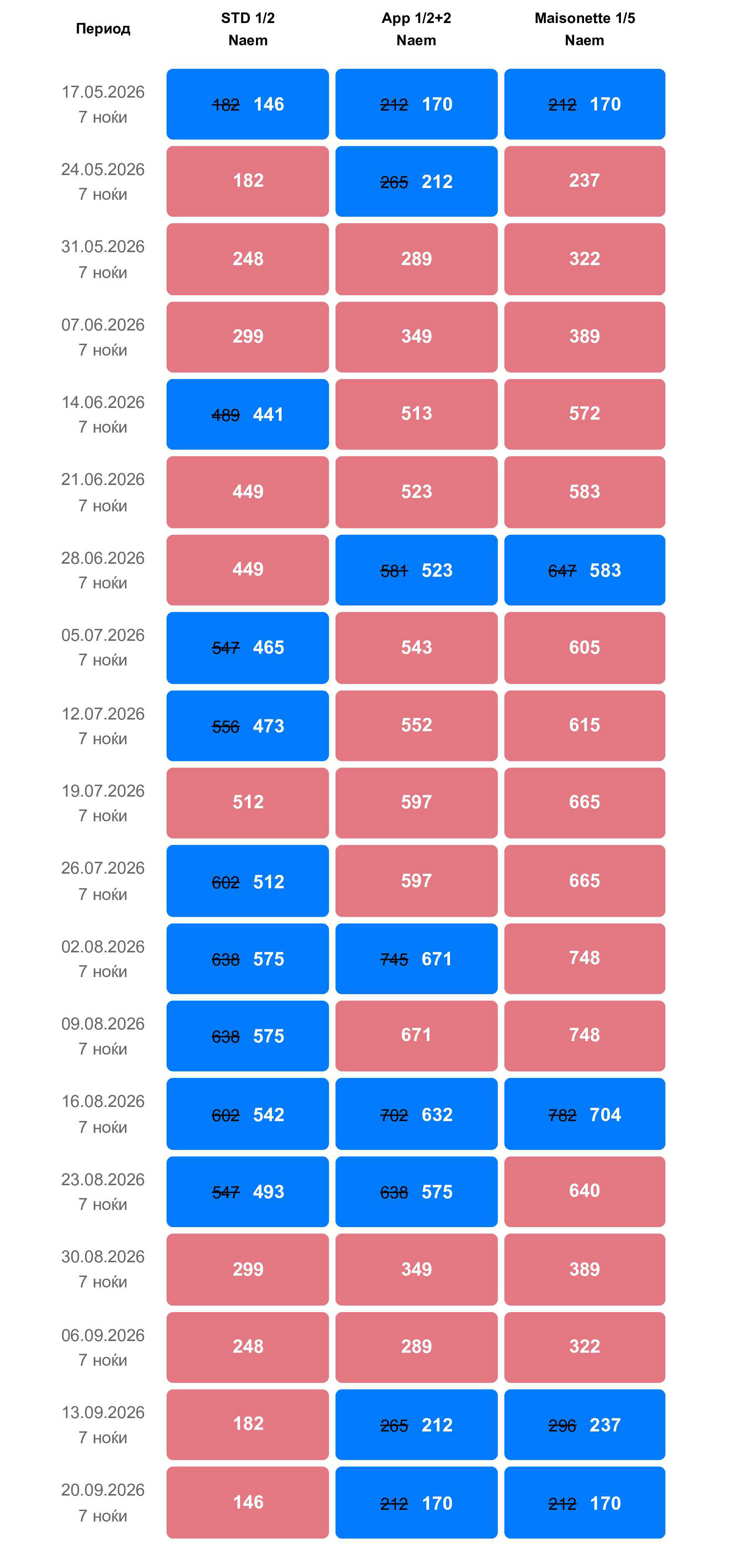 – Апартмани (1/3+1 или четирикреветни) – со брачен кревет во спалната соба и кауч на расклопување во дневниот дел;