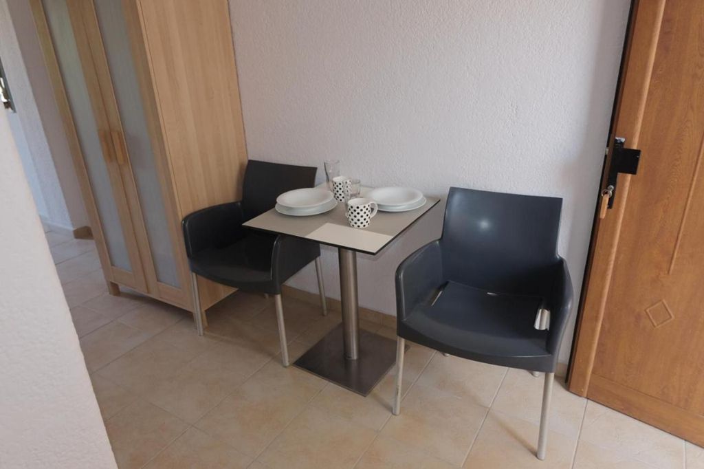 Студио бр. 2 – високо приземје. Располага со комплетно опремена кујна со голем фрижидер и мало решо, комплетно реновиран тоалет, сопствена тераса опремена со маса и столови и поглед кон парк, клима, ТВ, Wi-Fi. Има брачен кревет.