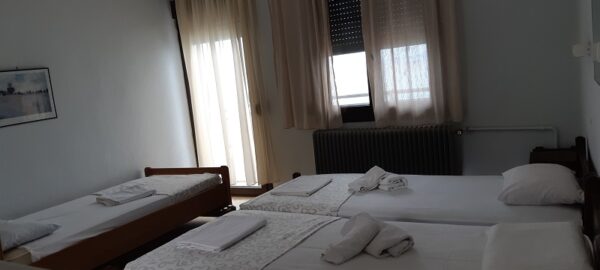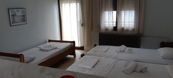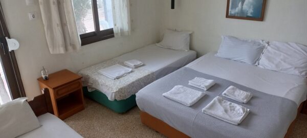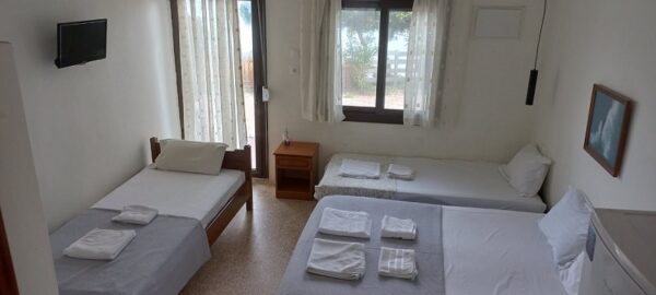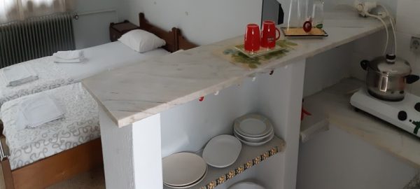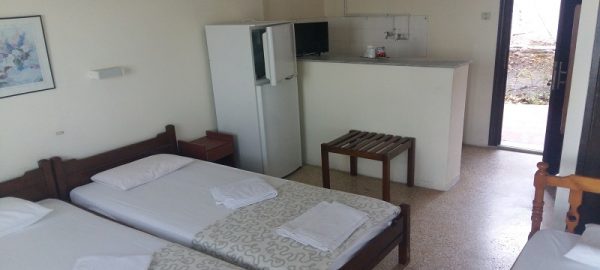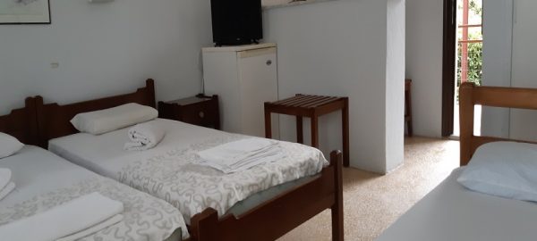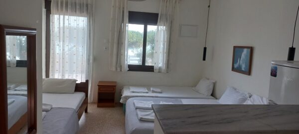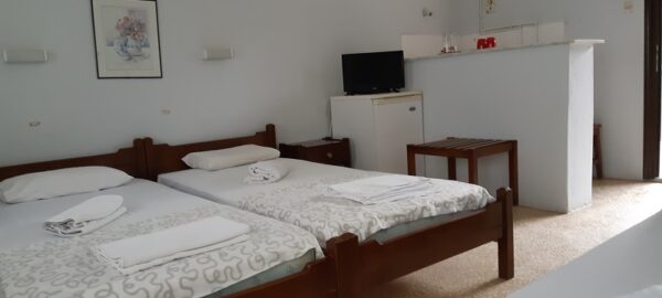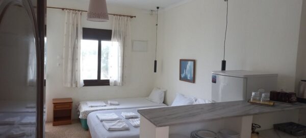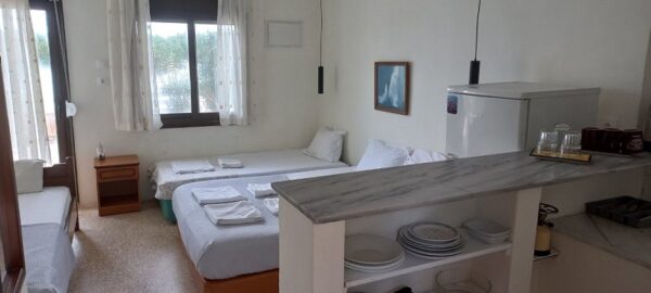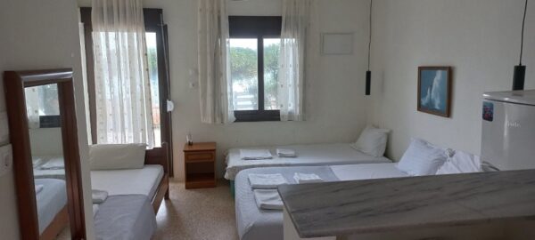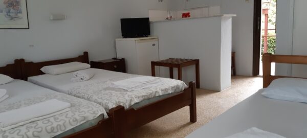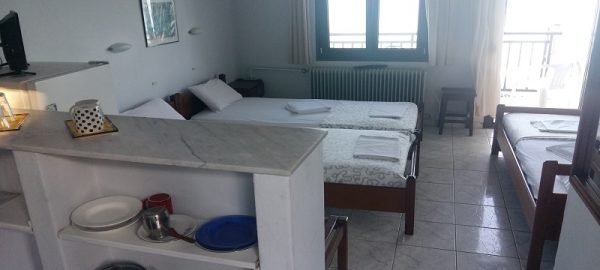 Студиото располага со три поединечни кревети, мини кујна со садови, решо, голем фрижидер, тв,клима уред, мало и тесно вц со туш. Има можност за дополнително креветче за дете до 03 години. Има директен поглед на море.