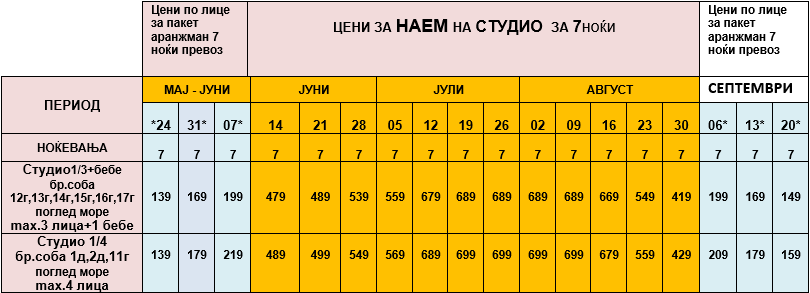 ОЗНАЧЕНИ СО ЗВЕЗДИЧКА * ВО ТАБЕЛАТА СЕ  ПАКЕТ АРАНЖМАНИ И СЕ ДАДЕНИ ПО ЛИЦЕ ЗА 7 НОЌИ СО ВКЛУЧЕН АВТОБУСКИ ПРЕВОЗ