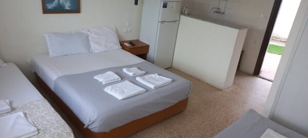 Студиото располага со еден дупол кревет и два поединечни кревети, мини кујна со садови, решо, голем фрижидер, тв, клима уред, мало и тесно вц со туш. Има можност за дополнително креветче за дете до 03 години. Има директен поглед на море.