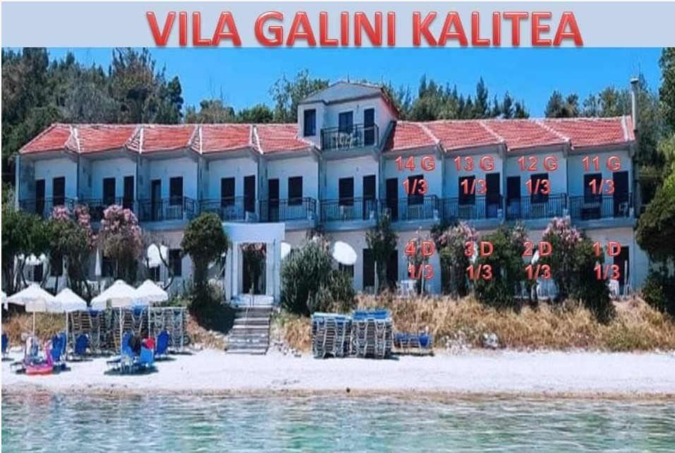 Вилата ГАЛИНИ се наоѓа на сама плажа.Располага со сопствена плажа, лежалки и чадор за секоја соба чие користење е достапно со нарачка на пијалок. Идеална локација  за вистински одмор со опуштање од звукот  и бојата на  морето.Сите соби се со директен поглед на море. Вилата располага со безжичен интернет со основна слаба брзина.