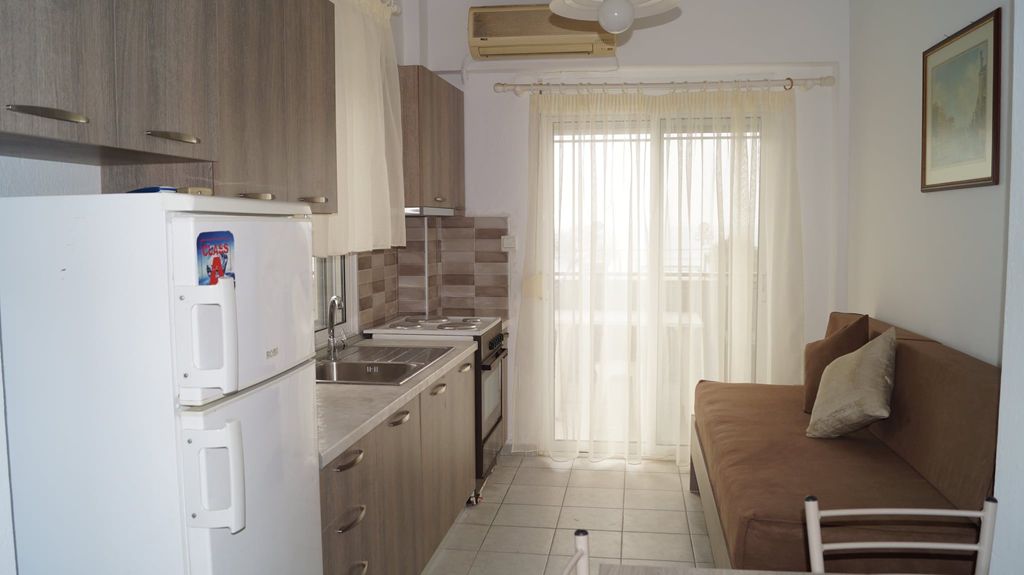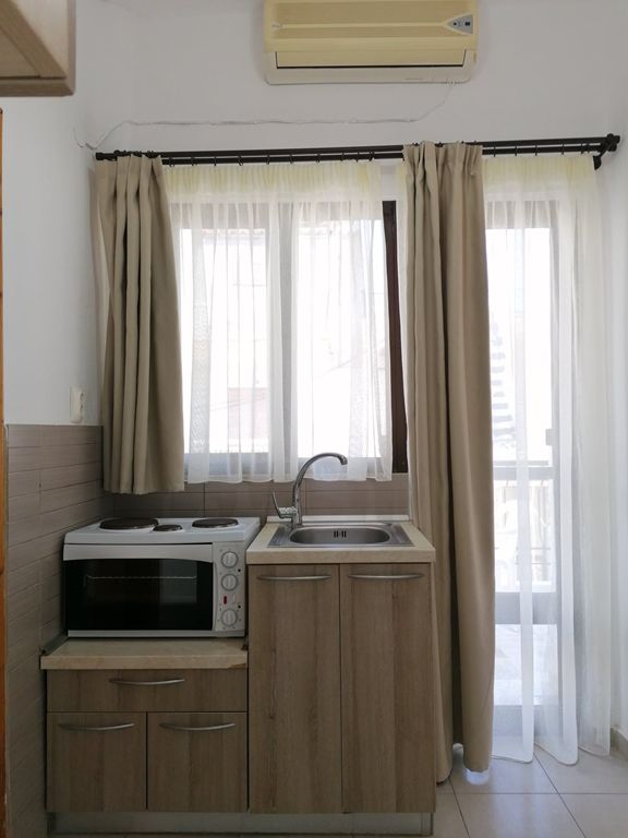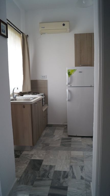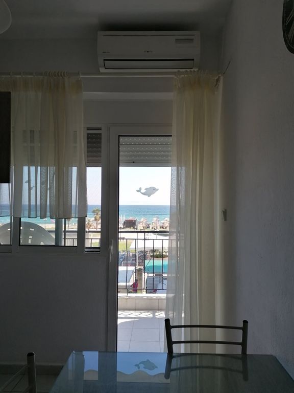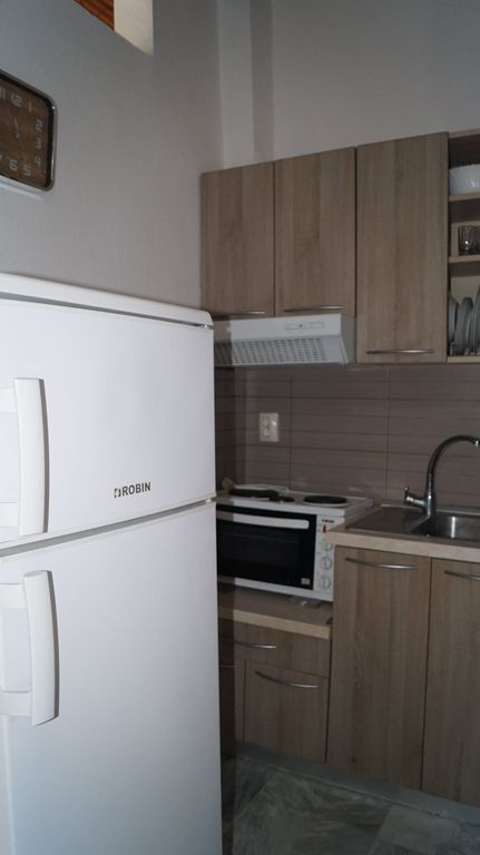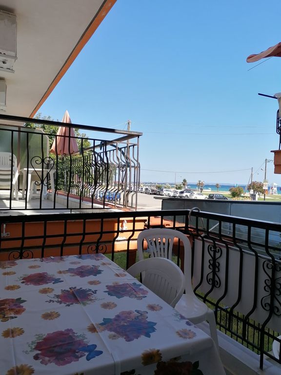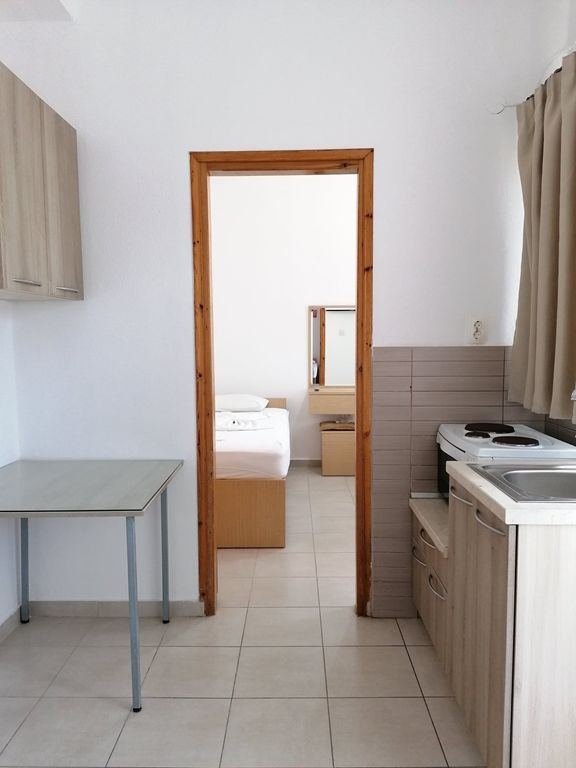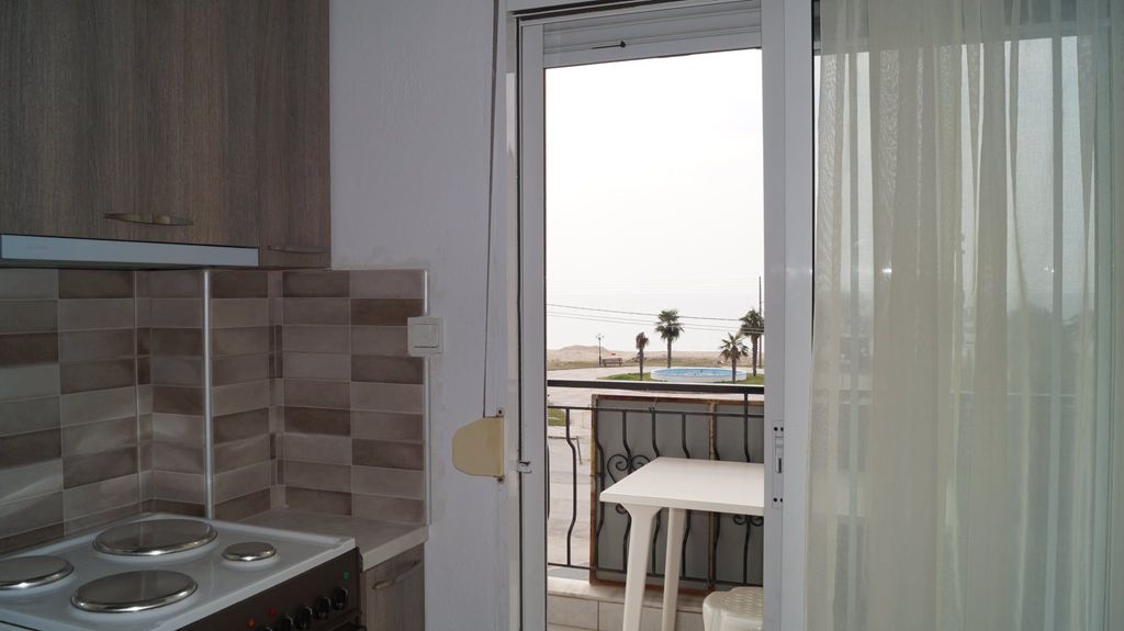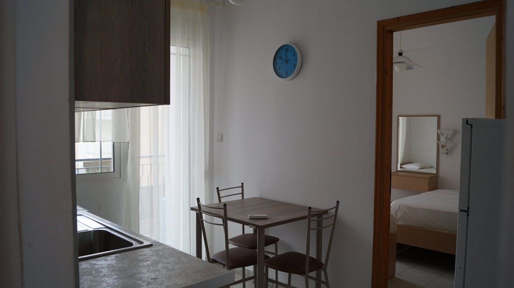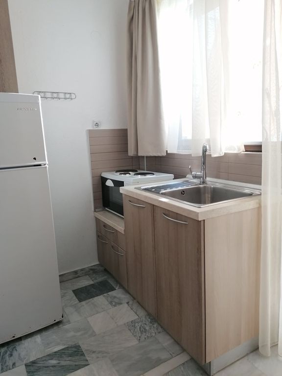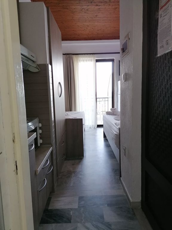 1/3 Студио бр. 10 – втор кат. Студиото има една просторија. На самиот влез има комплетно опремена кујна со мини шпорет со рерна, аспиратор и комплет садови за готвење и јадење. Во овој дел се наоѓа климата. Во продолжение на просторијата има еден брачен и еден единечен кревет, мебел, телевизор, фен и голем фрижидер со одделна комора. Од студиото се излегува на терасата која има директен поглед на море и е опремена со пластична маса и столчиња. Има потесно купатило со туш.