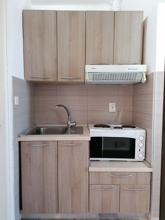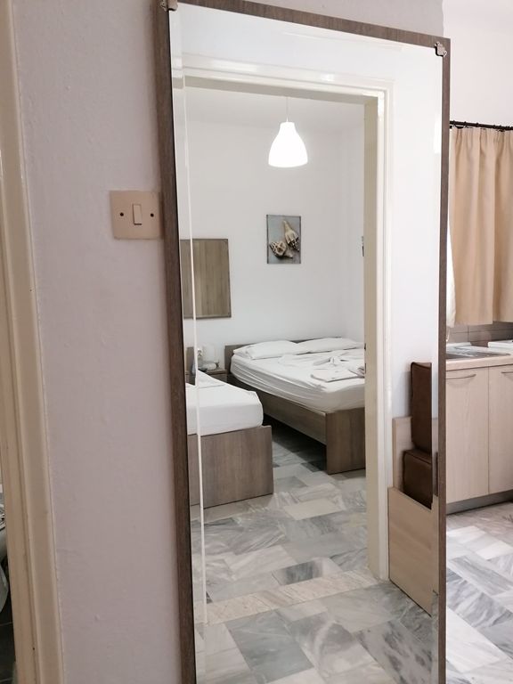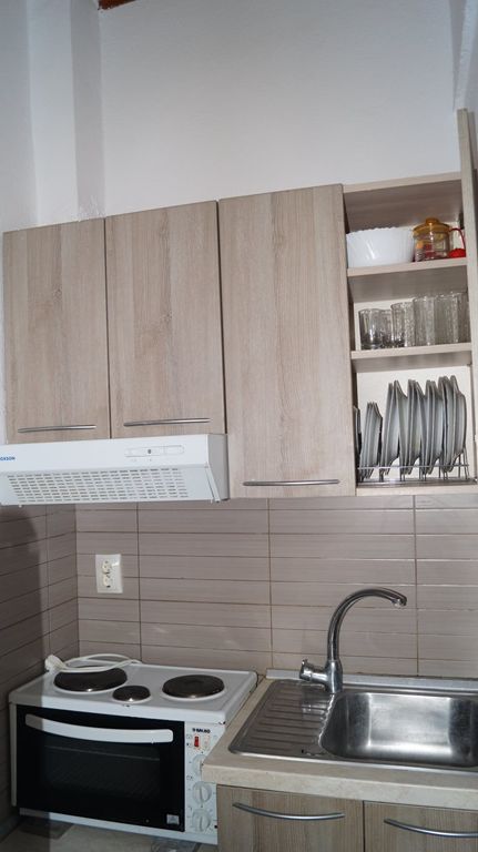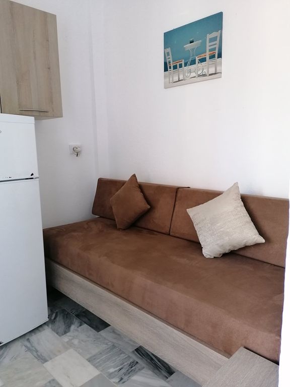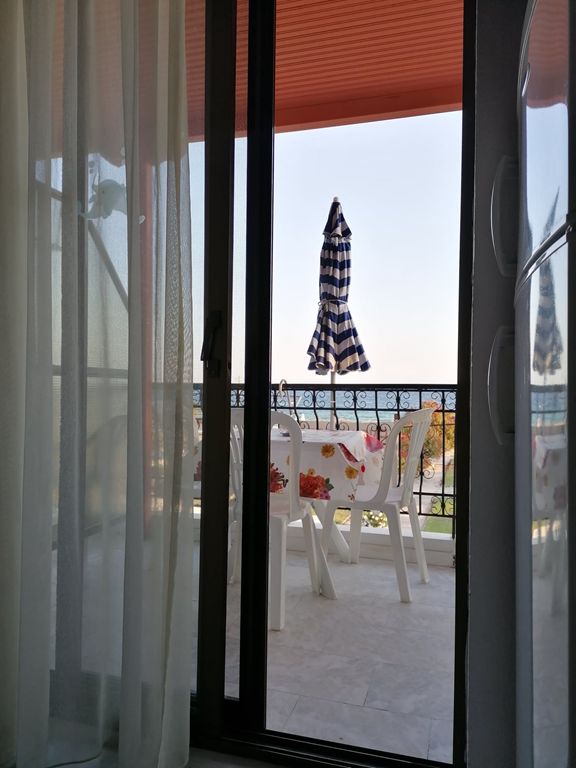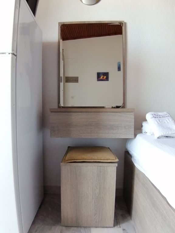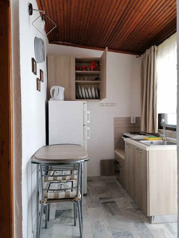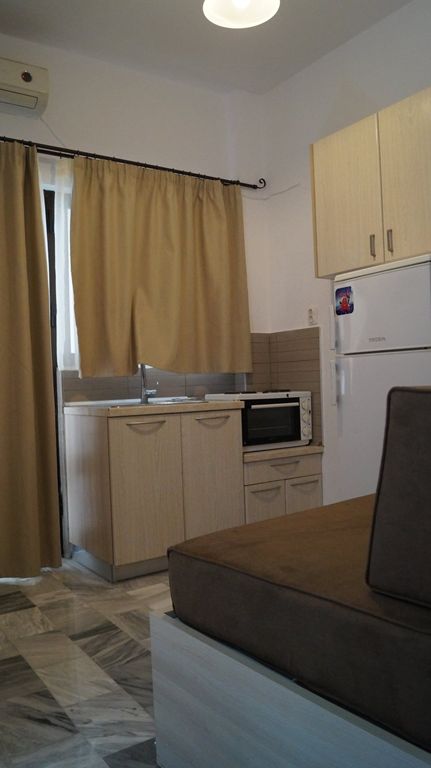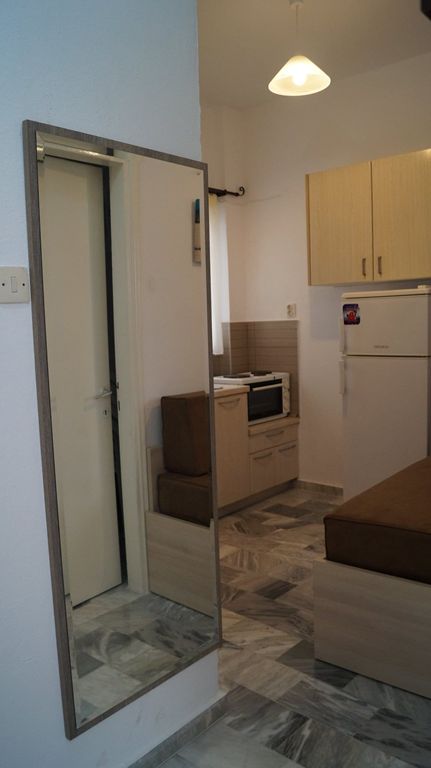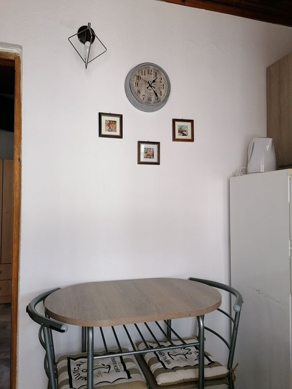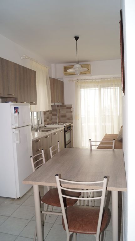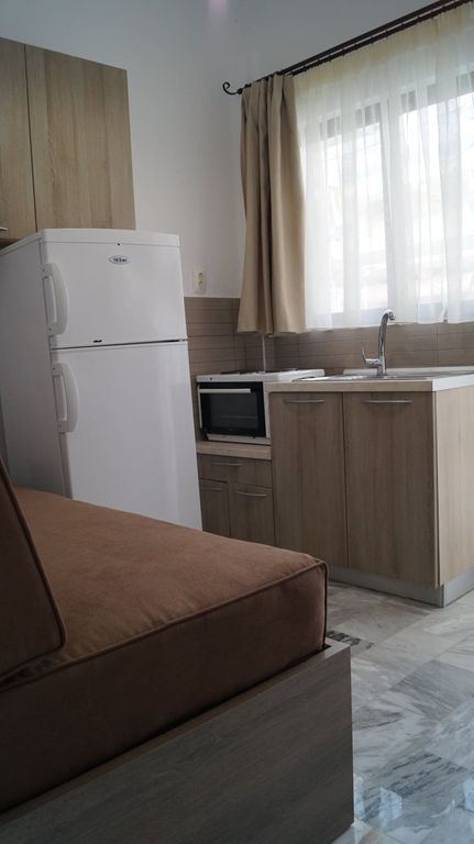 1/3 Студио бр. 10 – втор кат. Студиото има една просторија. На самиот влез има комплетно опремена кујна со мини шпорет со рерна, аспиратор и комплет садови за готвење и јадење. Во овој дел се наоѓа климата. Во продолжение на просторијата има еден брачен и еден единечен кревет, мебел, телевизор, фен и голем фрижидер со одделна комора. Од студиото се излегува на терасата која има директен поглед на море и е опремена со пластична маса и столчиња. Има потесно купатило со туш.