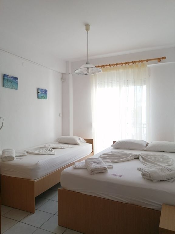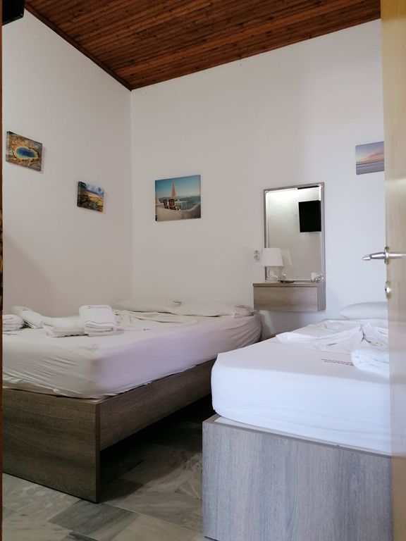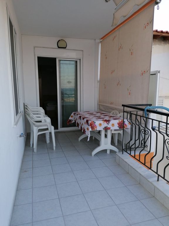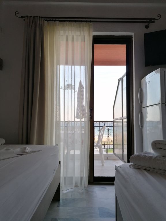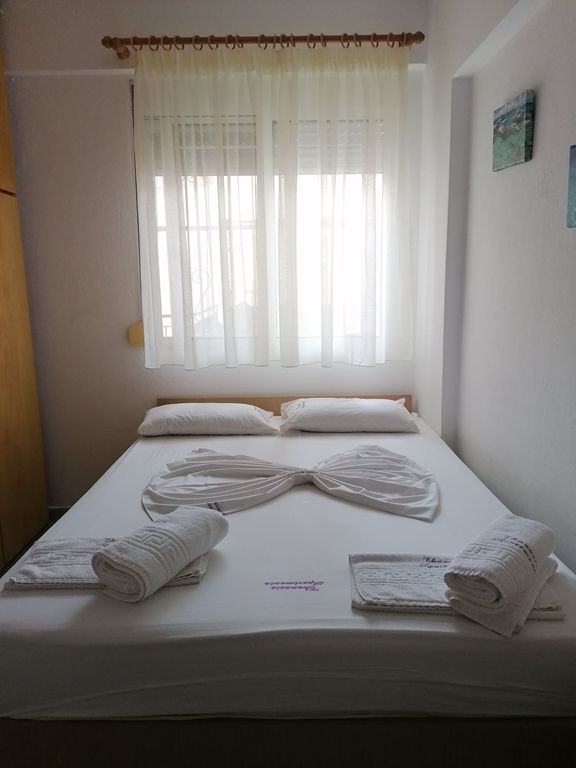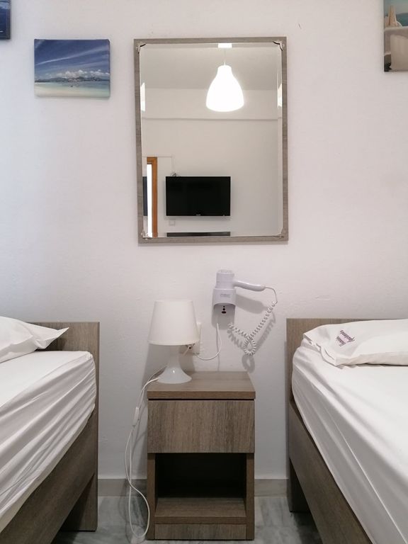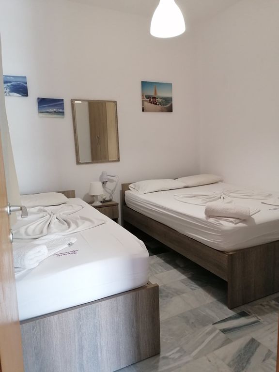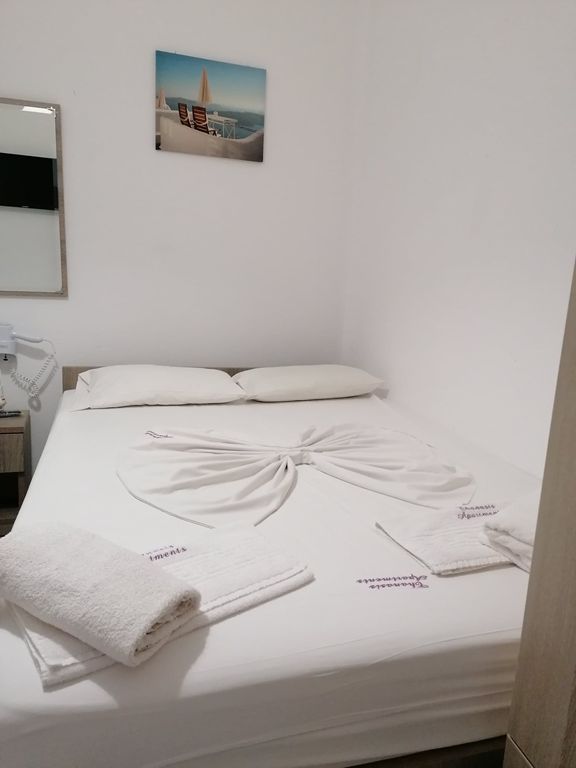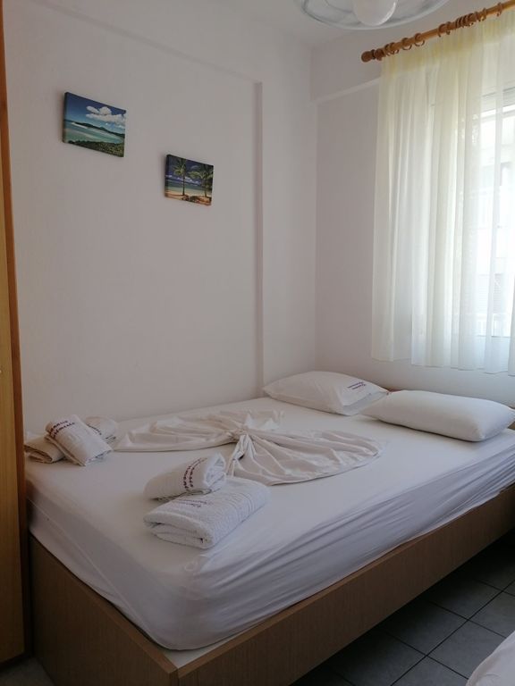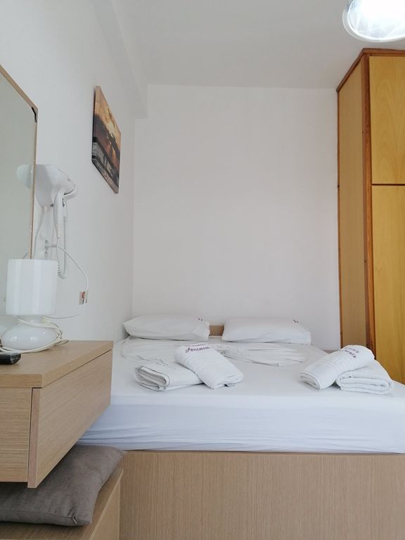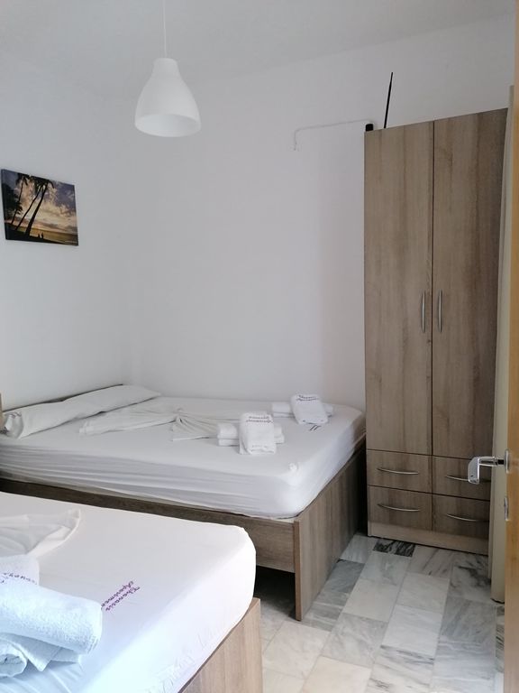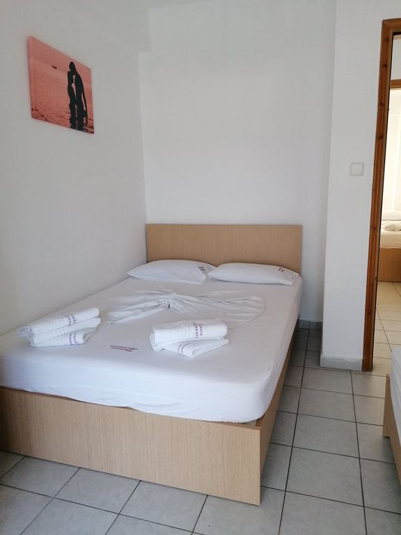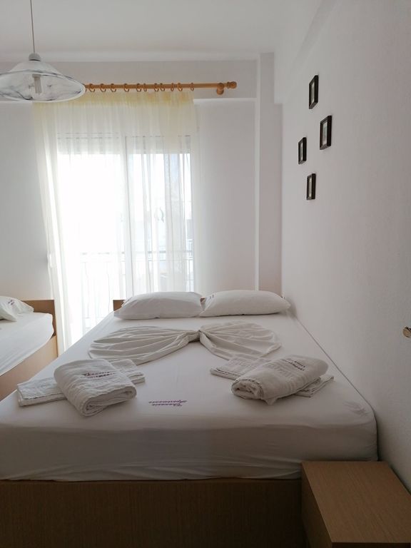 1/6 Дуплекс апартман бр. 29 – втор кат. Дуплекс апартманот има три простории, од кои две се посебно издвоени спални соби со врати и посебна кујна што се наоѓа во средина меѓу двете соби. Во секоја спална соба има по еден стандарден брачен кревет (димензии 190-140 см) и еден стандарден единечен кревет (димензии 190-90 см), мебел, фен и телевизор во секоја спална соба. Од едната спална соба се излегува на голема пространа тераса со директен фронтален поглед море, опремена со пластична маса, столчиња и тенда а и од другата спална соба исто така има уште една помала тераса која гледа кон улица. Во средината меѓу двете спални соби има пространа комплетно опремена кујна во која има голем шпорет со рерна, аспиратор, голем фрижидер со одделна комора и комплет садови за готвење и јадење. Тука се наоѓа и клима уредот. Од кујната се излегува на истата тераса која продолжува кон едната спална соба. Дуплексот располага со сопствен стандарден тоалет со туш.