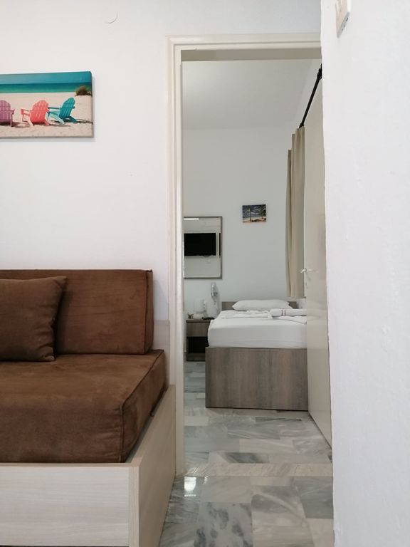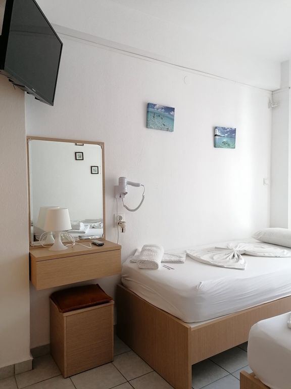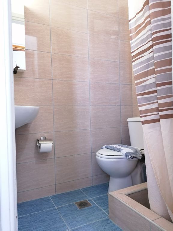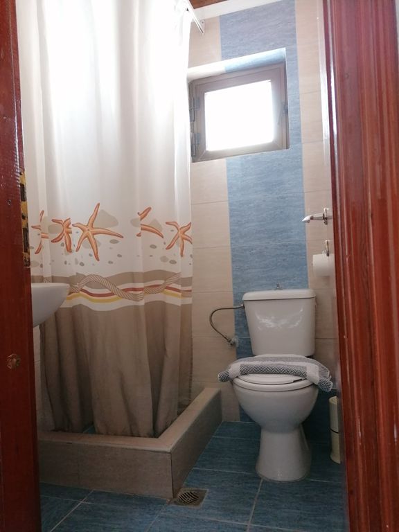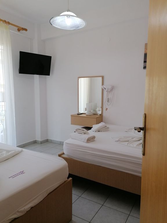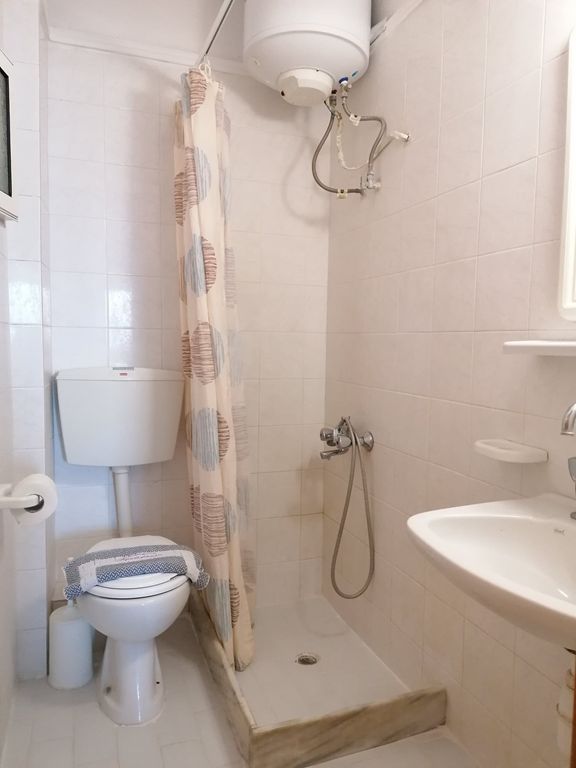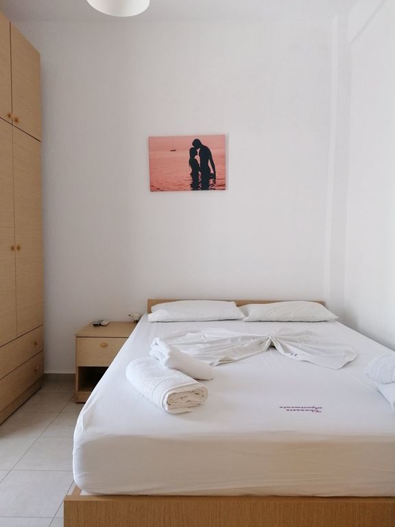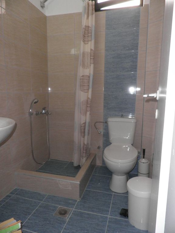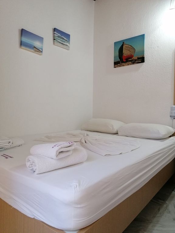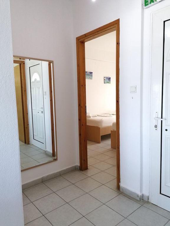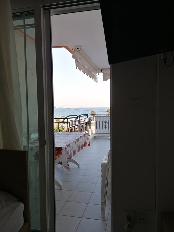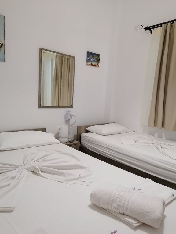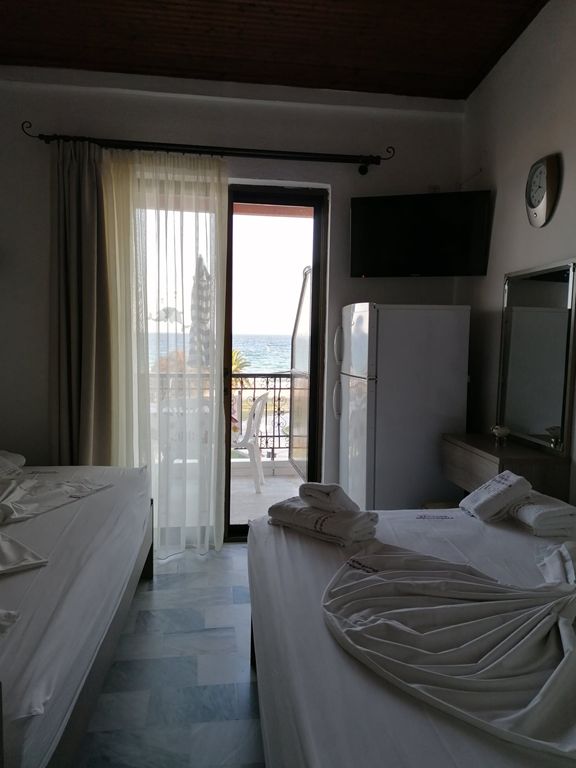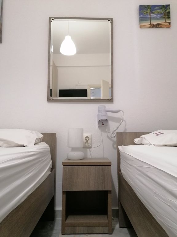 1/6 Дуплекс апартман бр. 29 – втор кат. Дуплекс апартманот има три простории, од кои две се посебно издвоени спални соби со врати и посебна кујна што се наоѓа во средина меѓу двете соби. Во секоја спална соба има по еден стандарден брачен кревет (димензии 190-140 см) и еден стандарден единечен кревет (димензии 190-90 см), мебел, фен и телевизор во секоја спална соба. Од едната спална соба се излегува на голема пространа тераса со директен фронтален поглед море, опремена со пластична маса, столчиња и тенда а и од другата спална соба исто така има уште една помала тераса која гледа кон улица. Во средината меѓу двете спални соби има пространа комплетно опремена кујна во која има голем шпорет со рерна, аспиратор, голем фрижидер со одделна комора и комплет садови за готвење и јадење. Тука се наоѓа и клима уредот. Од кујната се излегува на истата тераса која продолжува кон едната спална соба. Дуплексот располага со сопствен стандарден тоалет со туш.
