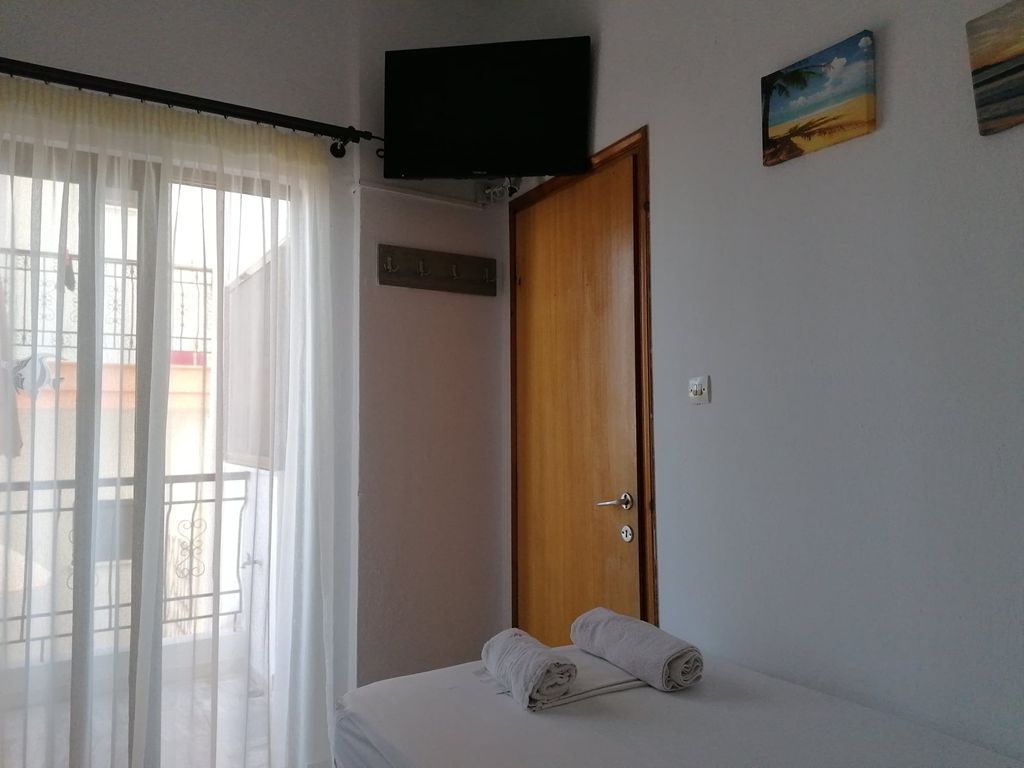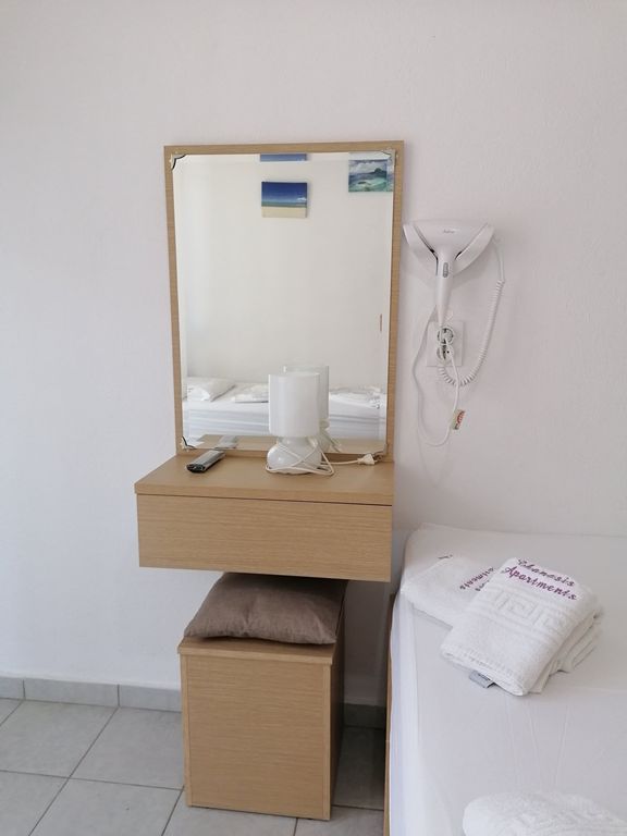 1/3+1 Апартман бр. 13 – прв кат. Апартманот има две простории кои меѓу себе се одделени со врата. Во првата просторија има еден единечен кревет (димензии 190-90 см) и комплетно опремена кујна во која има мини шпорет со рерна, голем фрижидер со одделна комора и комплет садови за готвење и јадење. Тука се наоѓа климата. Во другата просторија има еден брачен кревет (димензии 192-140 см) и еден единечен кревет (димензии 180-82 см). Опременa е со квалитетен мебел, фен и телевизор. Терасата е помала и има страничен поглед на море, а опремена е со пластична маса и столчиња. Има стандарден тоалет со туш.