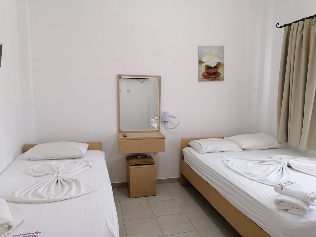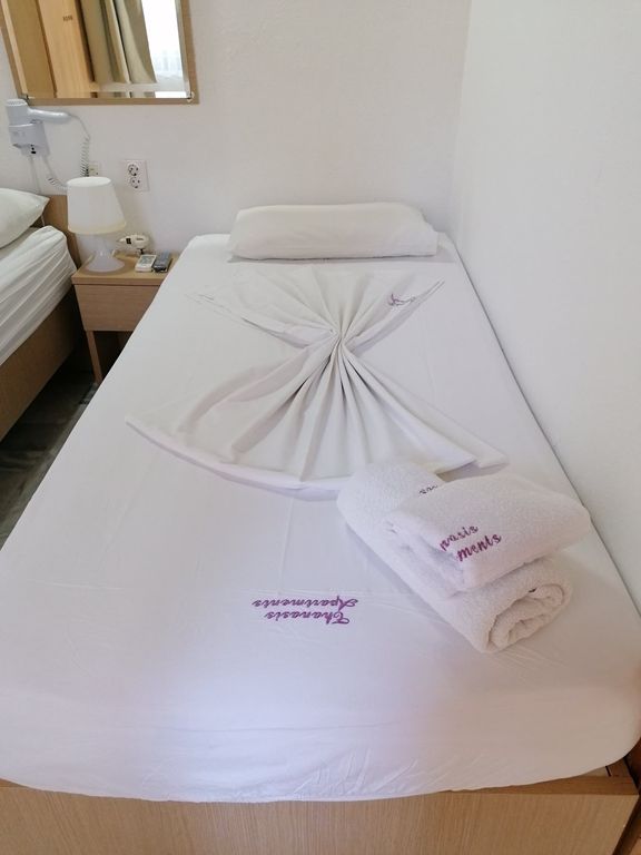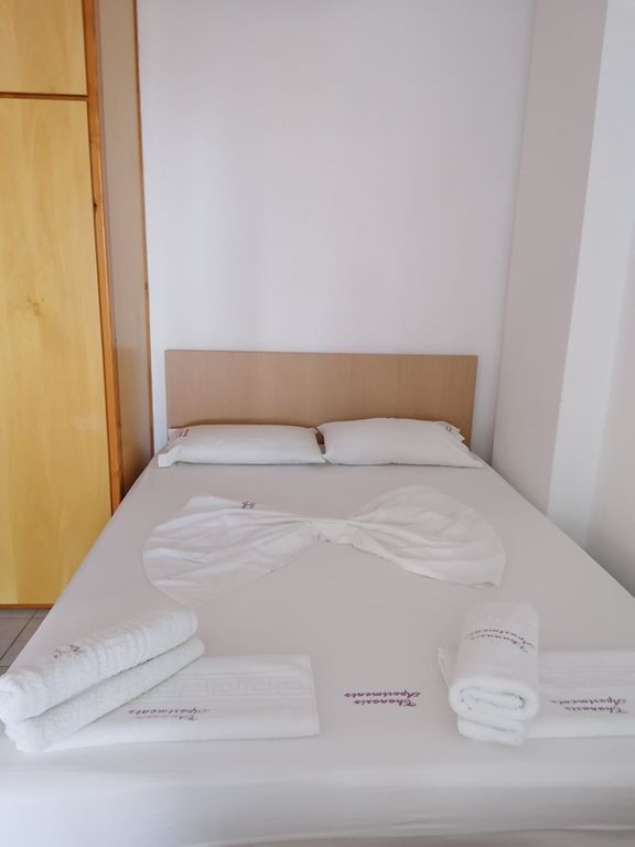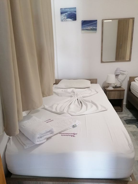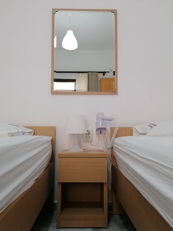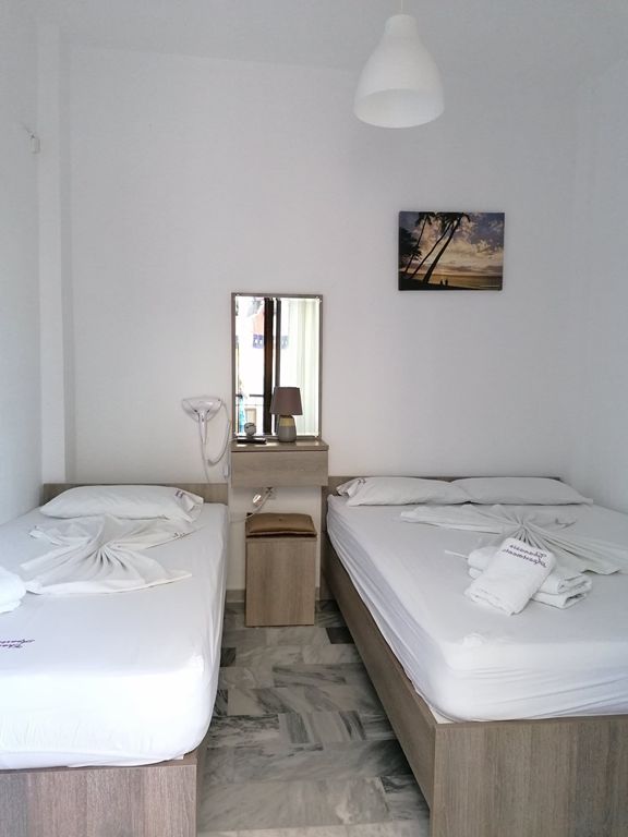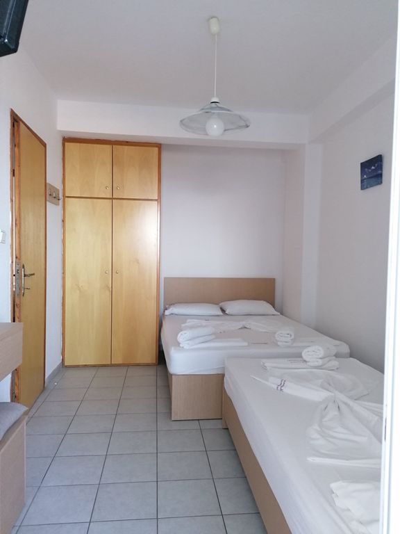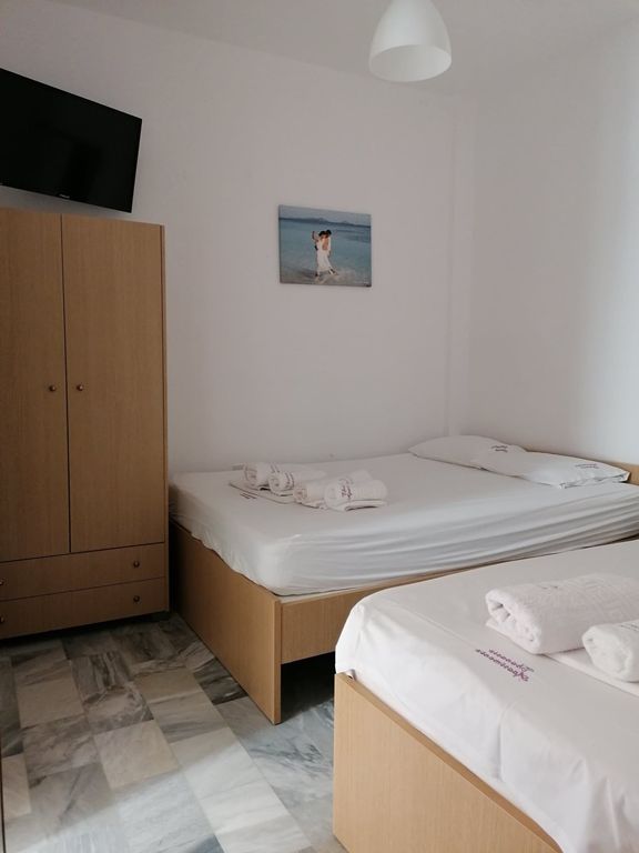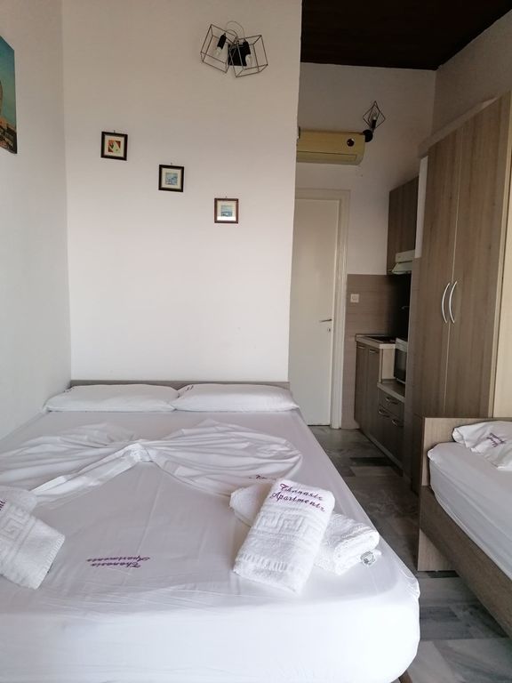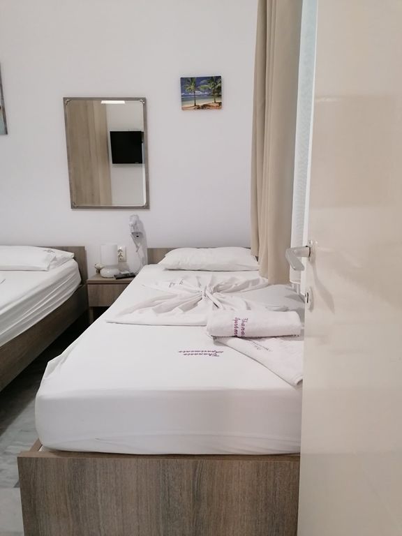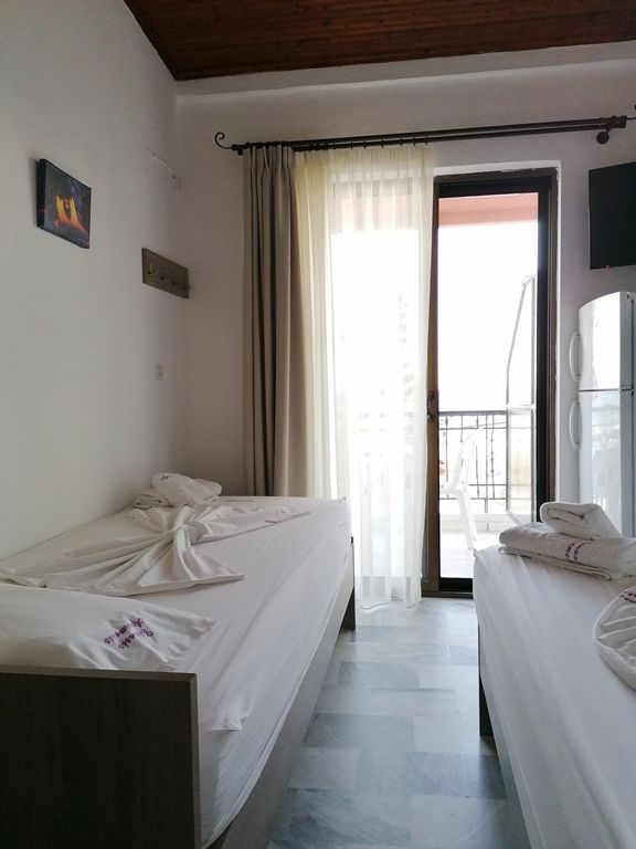 1/6 Дуплекс апартман бр. 24 – прв кат. Дуплекс апартманот има три простории, од кои две се посебно издвоени спални соби со врати и посебна кујна што се наоѓа во средина меѓу двете соби. Во едната спална соба има брачен кревет (димензии 195-135 см) и стандарден единечен кревет (димензии 190-90 см), мебел, фен и телевизор. Собата има прозорец кој има поглед кон улицата. Во втората спална соба има брачен кревет (димензии 192-132 см) и еден единечен кревет (димензии 180-85 см), мебел, фен и телевизор. Од собата се излегува на долга тераса со поглед на улицата, опремена со пластична маса и столчиња. Во средината меѓу двете спални соби има комплетно опремена кујна во која има голем шпорет со рерна, аспиратор, голем фрижидер со одделна комора и комплет садови за готвење и јадење. Тука се наоѓа и клима уредот. Од кујната исто така се излегува на терасата. Апартманот има станадарден тоалет со туш.