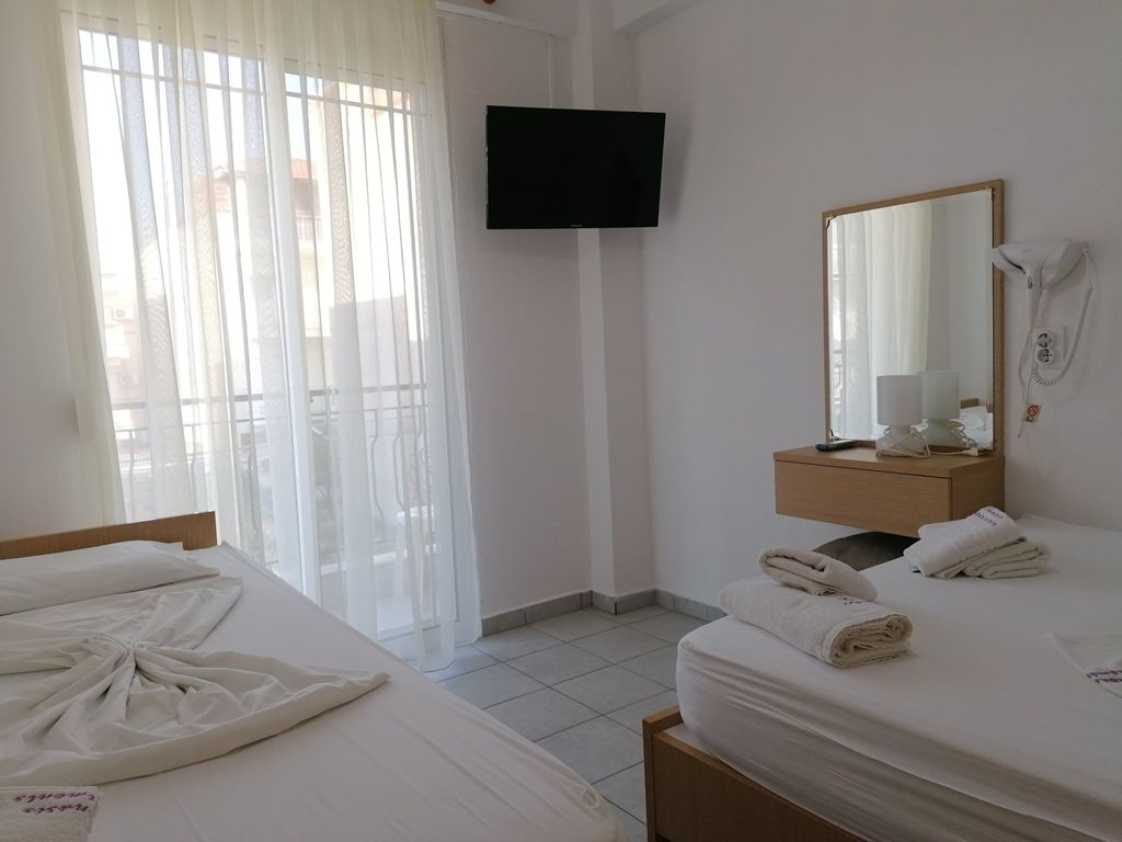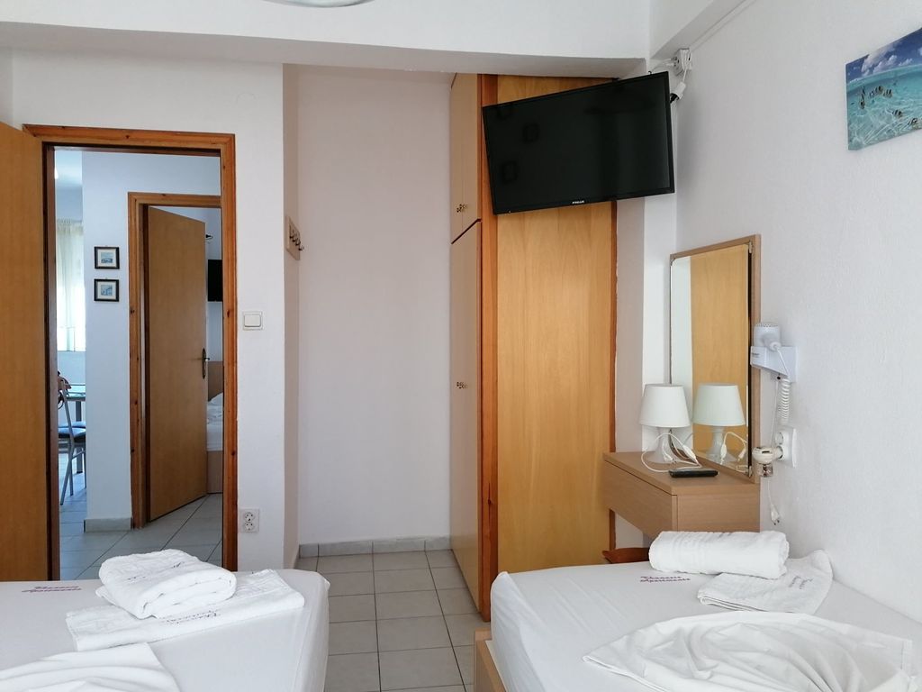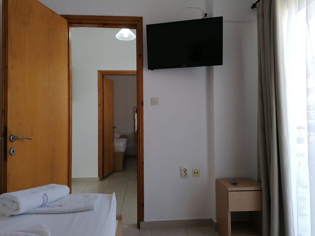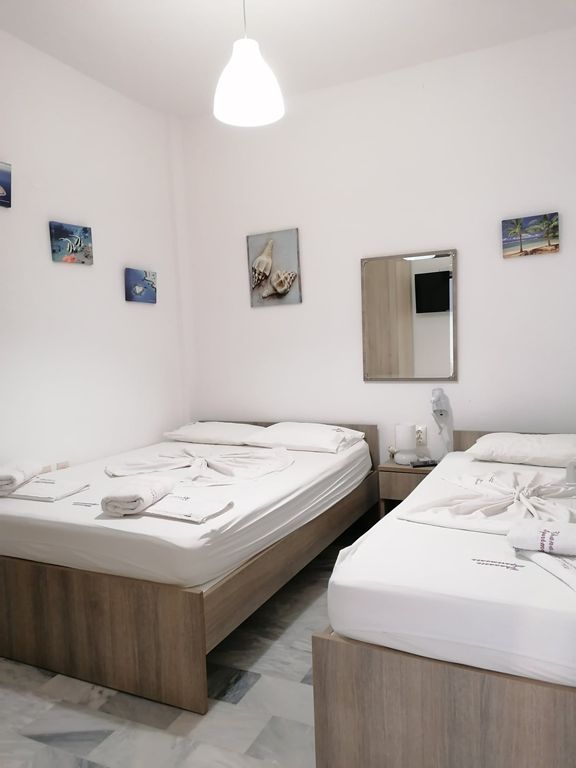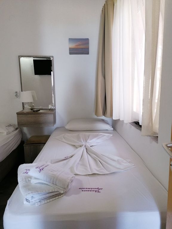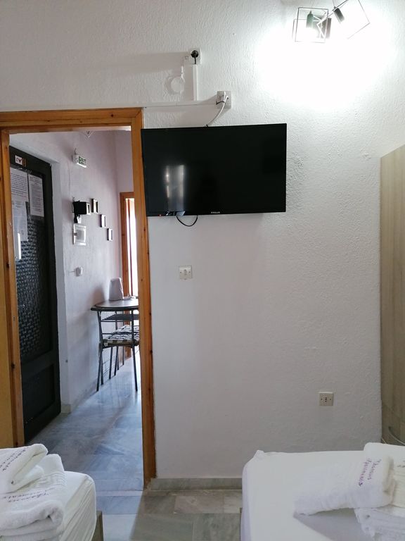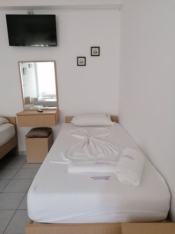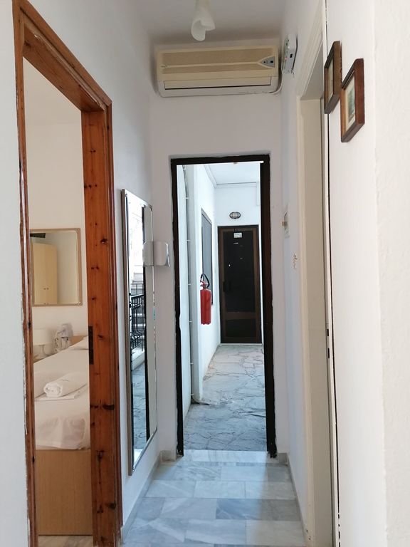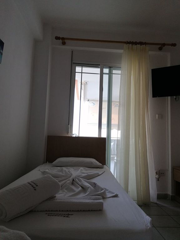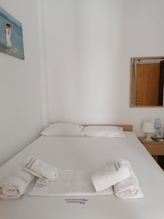 1/6 Дуплекс апартман бр. 24 – прв кат. Дуплекс апартманот има три простории, од кои две се посебно издвоени спални соби со врати и посебна кујна што се наоѓа во средина меѓу двете соби. Во едната спална соба има брачен кревет (димензии 195-135 см) и стандарден единечен кревет (димензии 190-90 см), мебел, фен и телевизор. Собата има прозорец кој има поглед кон улицата. Во втората спална соба има брачен кревет (димензии 192-132 см) и еден единечен кревет (димензии 180-85 см), мебел, фен и телевизор. Од собата се излегува на долга тераса со поглед на улицата, опремена со пластична маса и столчиња. Во средината меѓу двете спални соби има комплетно опремена кујна во која има голем шпорет со рерна, аспиратор, голем фрижидер со одделна комора и комплет садови за готвење и јадење. Тука се наоѓа и клима уредот. Од кујната исто така се излегува на терасата. Апартманот има станадарден тоалет со туш.