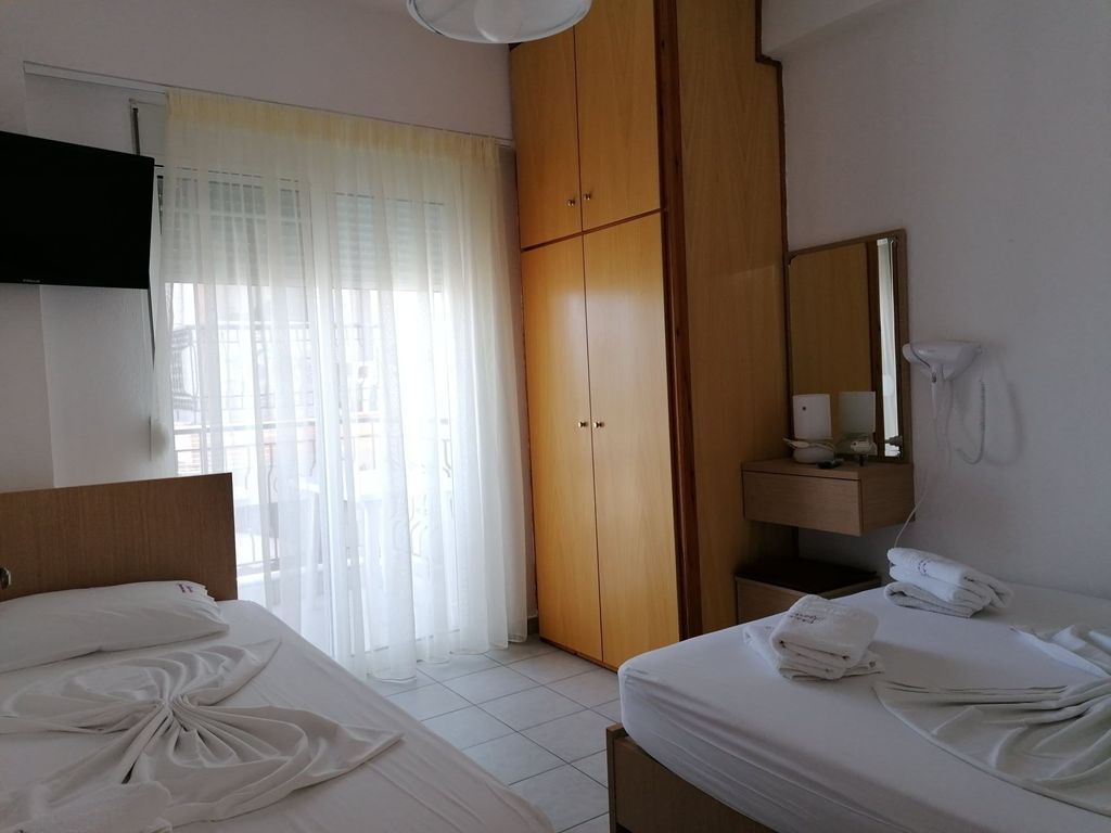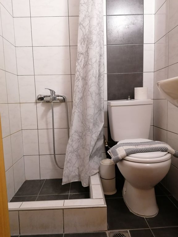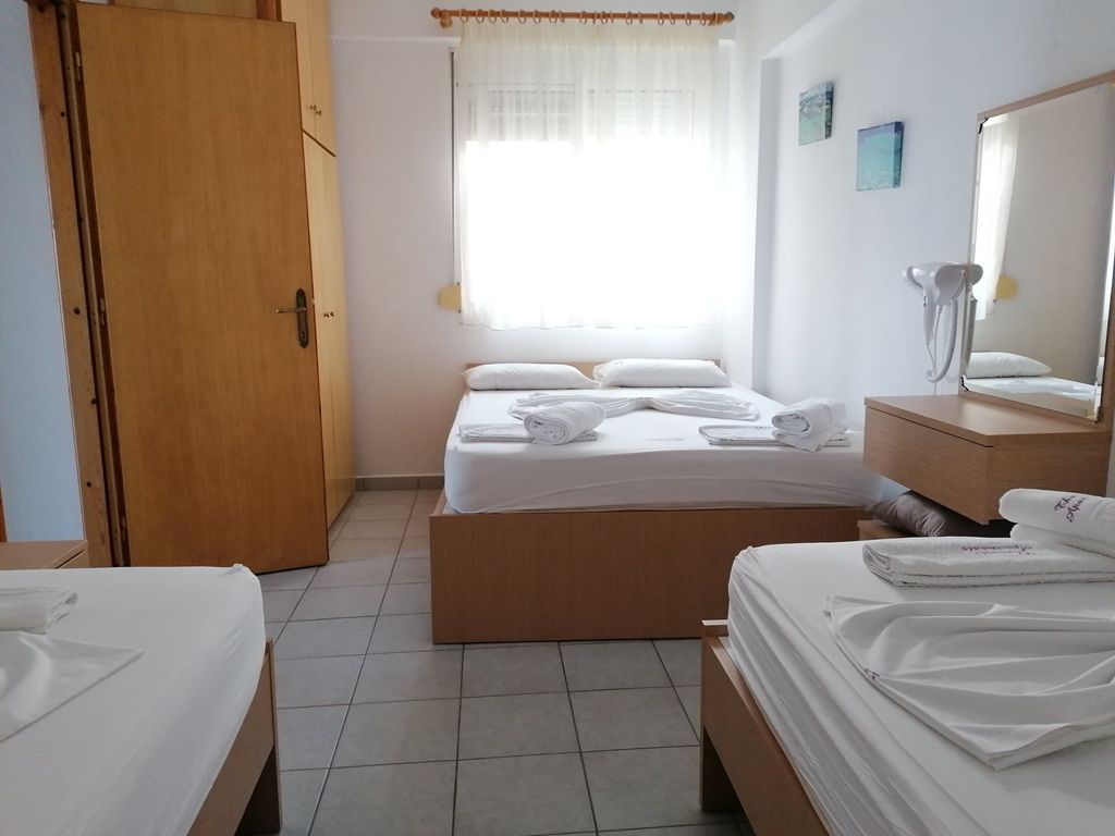 1/5 Дуплекс апартман бр. 16 – втор кат. Дуплекс апартманот има три простории, од кои две се посебно издвоени спални соби со врати и посебна кујна што се наоѓа во средина меѓу двете соби. Во едната спална соба има еден брачен кревет (димензии 195-135 см) и еден единечен кревет (димензии 190-90 см), квалитетен мебел, фен и телевизор. Во втората спална соба има брачен кревет (димензии 192-132 см). Од едната соба и од кујната се излегува на пространа тераса со поглед на улица опремена со пластична маса и столчиња. Во средината меѓу двете спални соби има комплетно опремена кујна во која има голем шпорет со рерна, аспиратор, голем фрижидер со одделна комора и комплет садови за готвење и јадење. Тука се наоѓа и клима уредот. Апартманот има реновиран простран тоалет со туш.