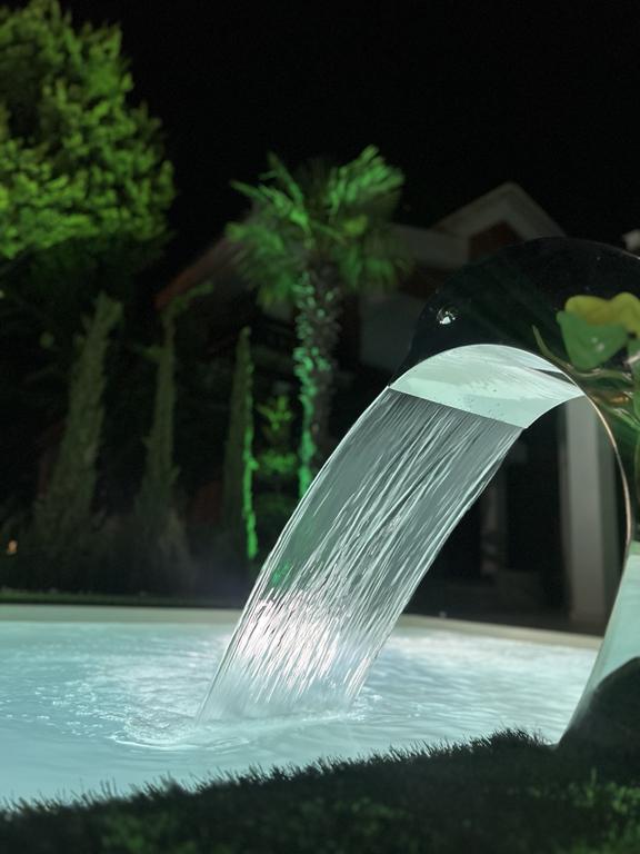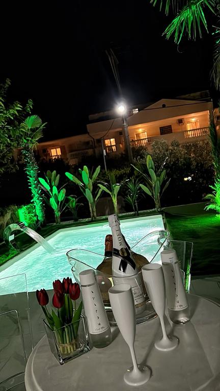 - Приземје: Дневна соба, комплетно опремена кујна, master b-room со две единечни легла, купатило, тераса, двор со гарнитура за седење,базен со џакузи.
