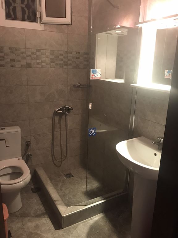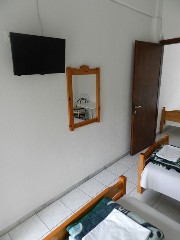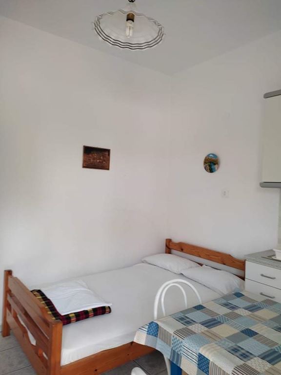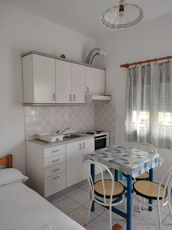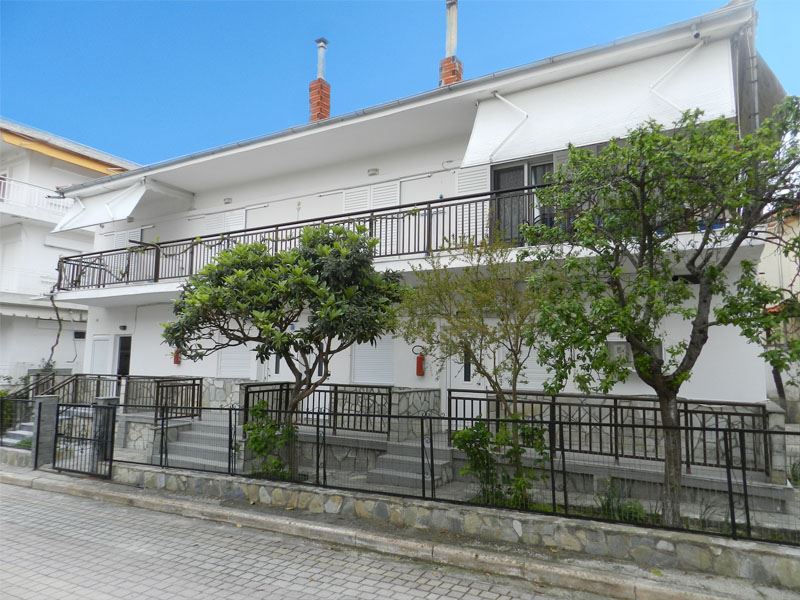 Сместување: Располага со апартмани за 3 и 4 лица. Четири апартмани се наоѓаат на високо приземје (бр.1, 2, 3, 4) и еден на прв спрат (бр.5). Се состојат од кујна каде има кревет на отварање или лежај со грчки димензи,голем фрижидер, шпорет БЕЗ рерна, основни садови за соодветниот број на лица , ТВ, интернет, купатило, клима, спална соба со брачен кревет или спална и единечен кревет, две тераси со поглед на улица и поглед на двор. Паркинг.