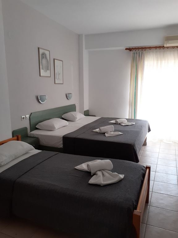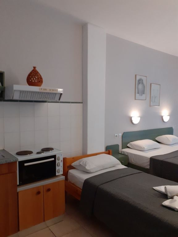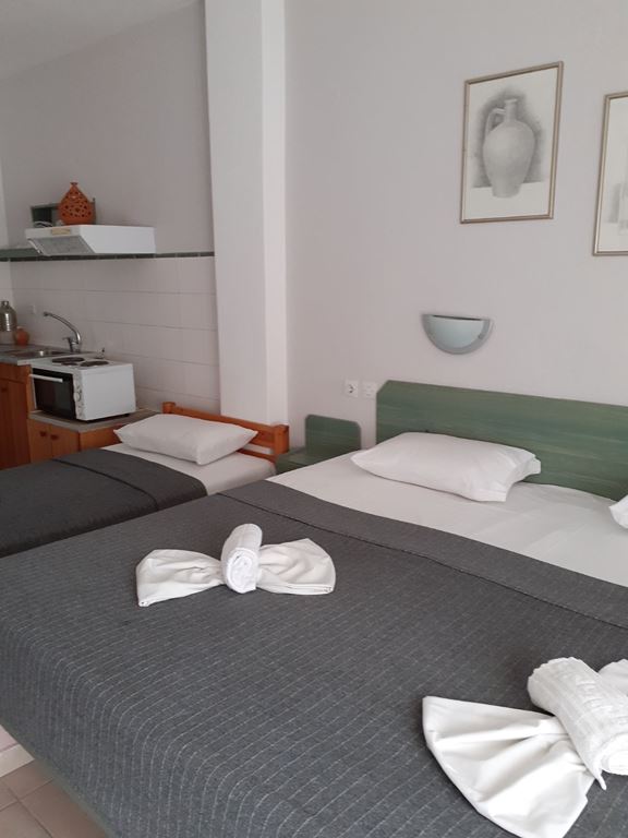 Студио 3 – 1/2+1  голем француски лежај погоден за сместување на 2 возрасни особи и 1 дете до 12 години, мал фрижидер, опремена кујна, шпорет БЕЗ рерна, основни садови за соодветниот број на лица , ТВ, интернет, купатило, клима, тераса со поглед на двор.