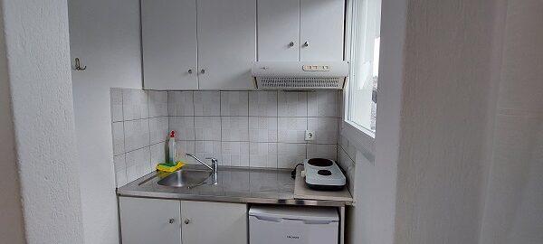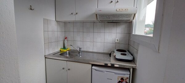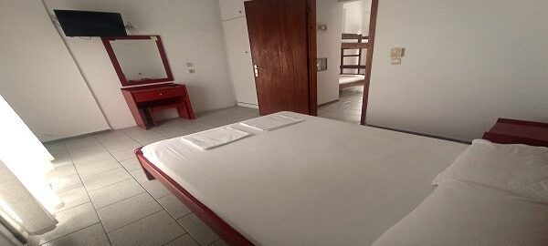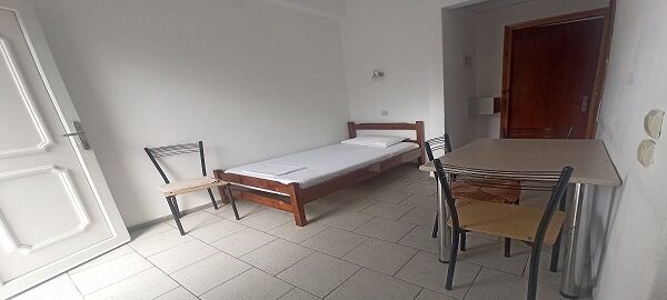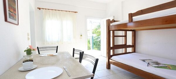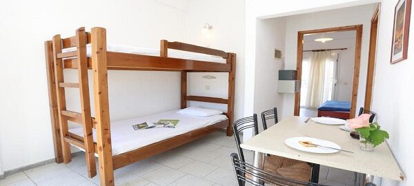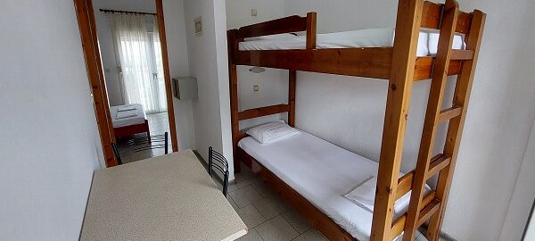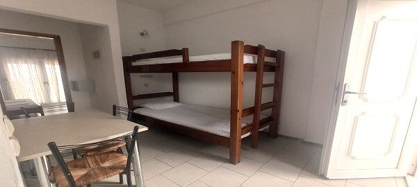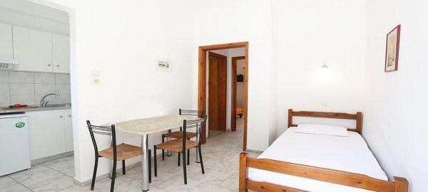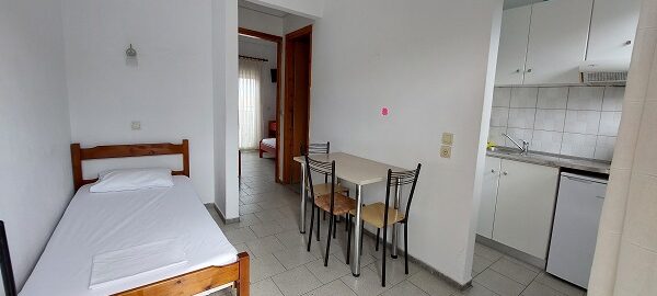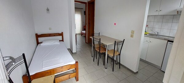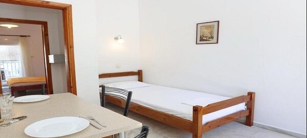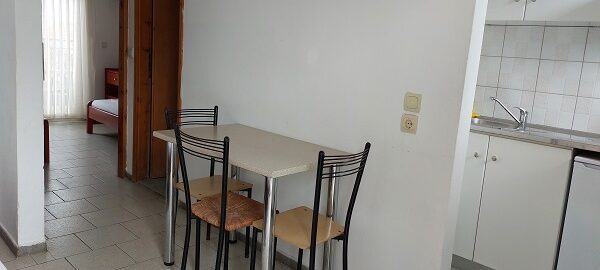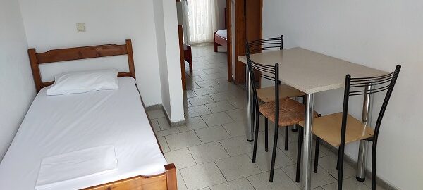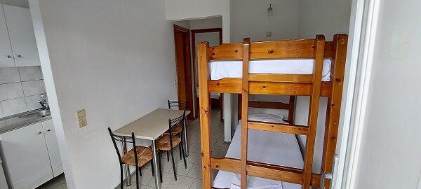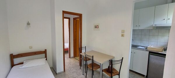 Апартманот располага со две простории ,купатило со вц и тераса. Кујната е одвоена со зид и  има два поединечни кревети на спрат за спиење на две лица, кујна комплетно опремена со кујнски инвентар, мал фрижидер,аспиратор,решо.Во спалната соба има  еден дупол кревет комотен за спиење на две лица , плакар за алишта, клима уред ,TVи излегува на тераса.Прозорите од терасите имаат ролетни. Од спалната се  излегува на тераса со маса и столици.