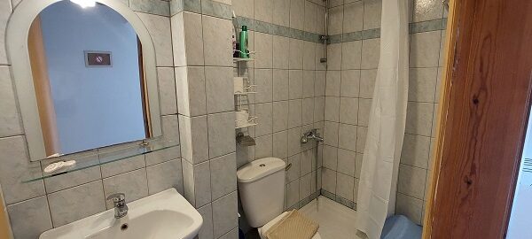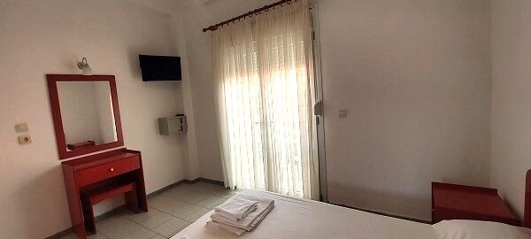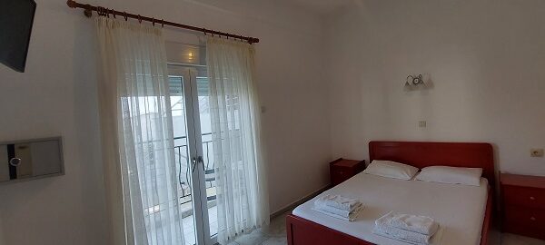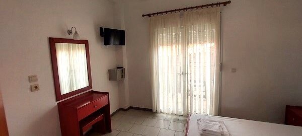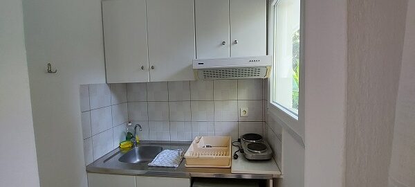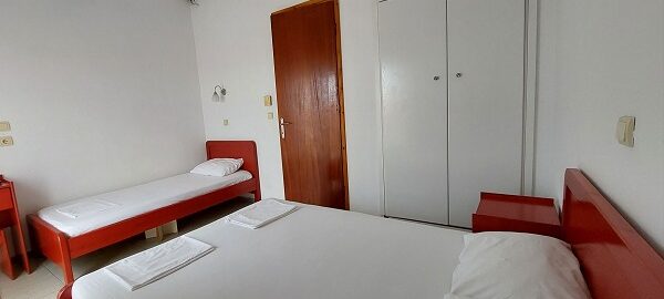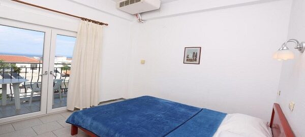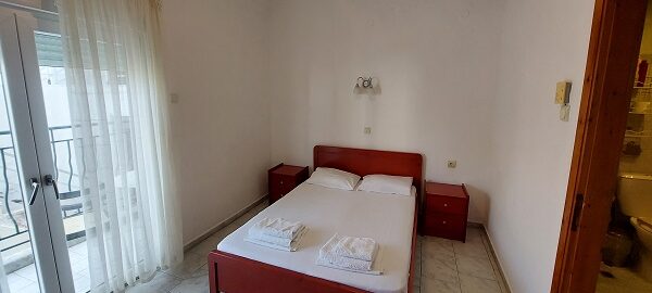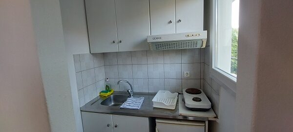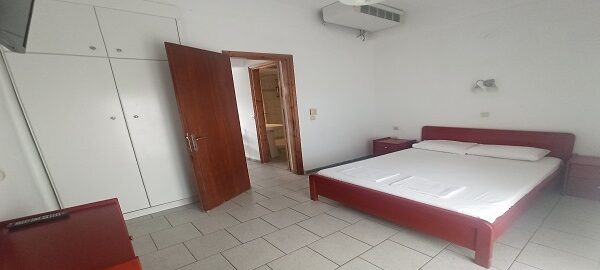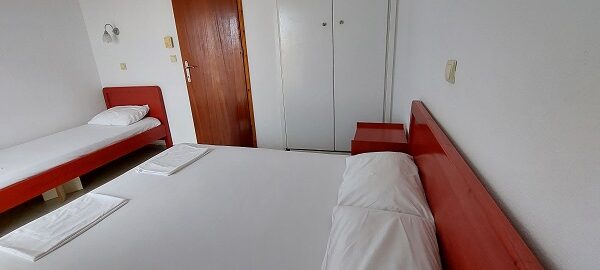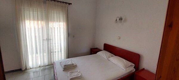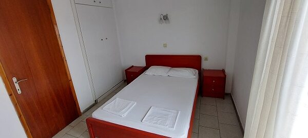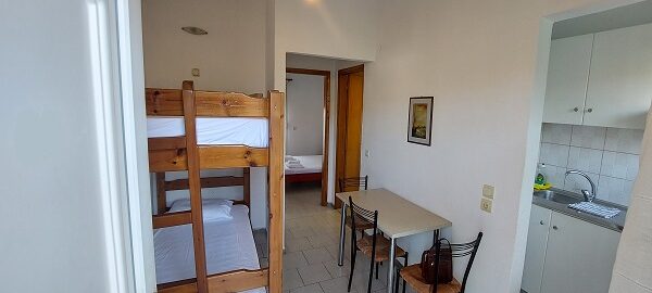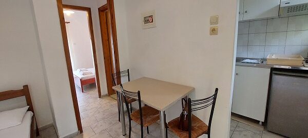 Апартманот располага со две простории ,купатило со вц и тераса. Кујната е одвоена со зид и  има два поединечни кревети на спрат за спиење на две лица, кујна комплетно опремена со кујнски инвентар, мал фрижидер,аспиратор,решо.Во спалната соба има  еден дупол кревет комотен за спиење на две лица, плакар за алишта, клима уред ,TVи излегува на тераса.Прозорите од терасите имаат ролетни. Од спалната се  излегува на тераса со маса и столици со поглед на море во далечина.