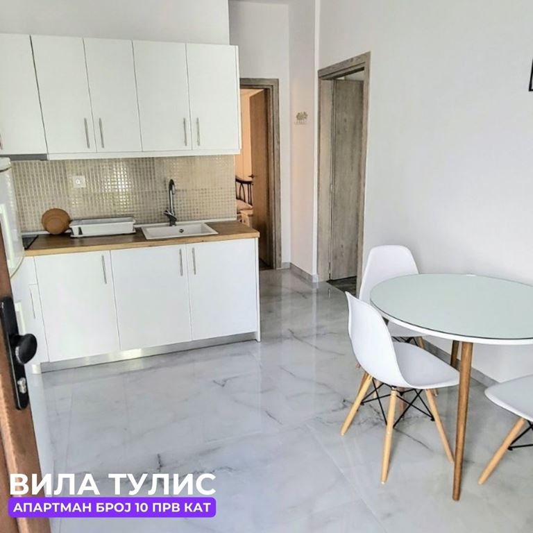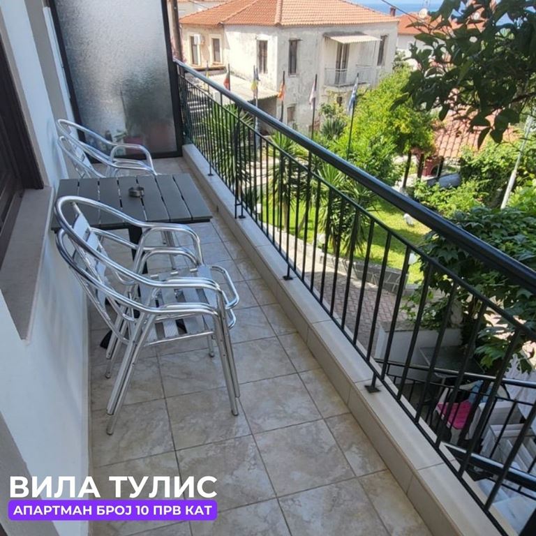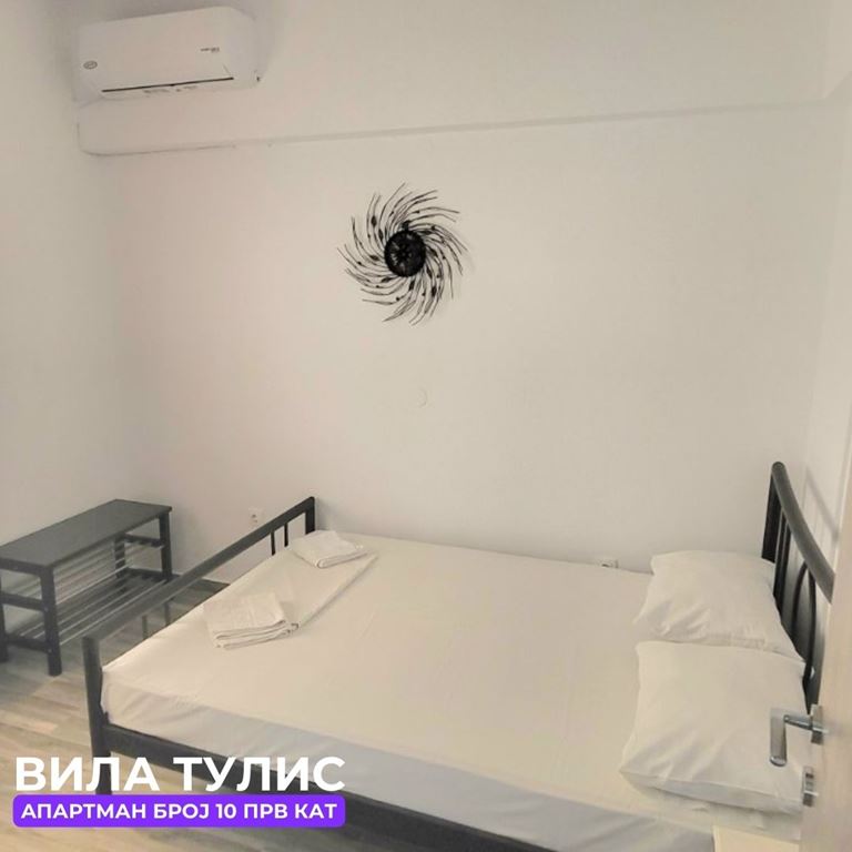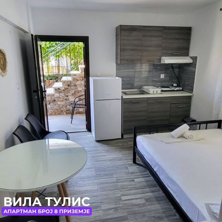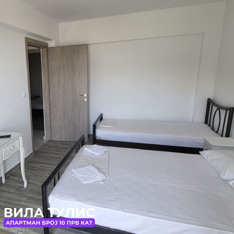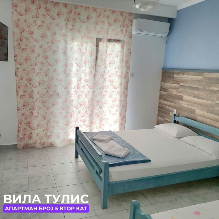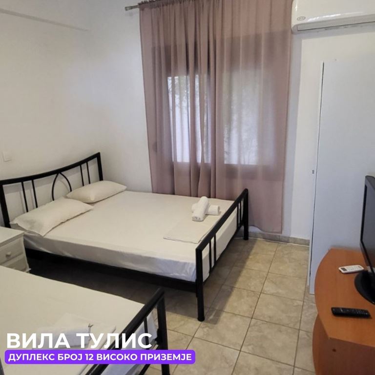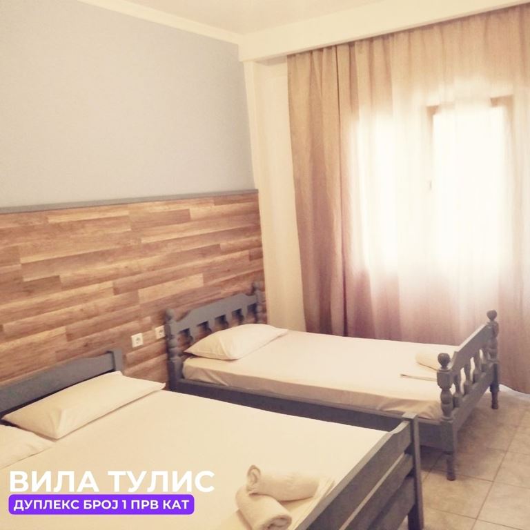 Вила Тулис  (целосно реновирана) се наоѓа на 300 метри од плажа во самиот  центар на Полихроно, веднаш над црквата. Вилата располага со апартмани за три, четири и дуплекс апартмани за пет лица, комплетно опремени со кујна, тоалет и тераса. За секој апартман има обезбедено приватен бесплатен паркинг, заеднички двор за дружење на гостите, иралиште за кошарка и приватна теретана. Во секој апартман на пасполагање има  големи пешкири за туширање. Одличен избор за семејства. 2024 Година имавме само пофалби за комодитет, хигена, локација и гостопримство. Сите апартмани се опремени со клима уред чие користење се доплаќа 35 евра за 7 ноќевања на лице место кај газдите на вилата.
