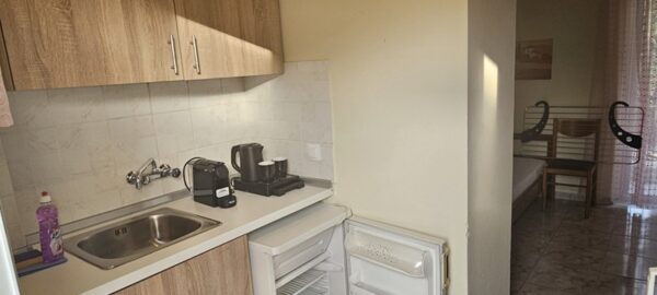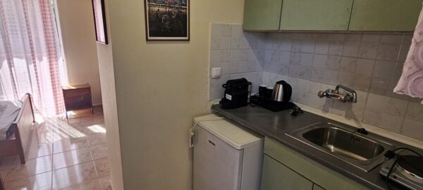 се наоѓа на прв кат.Има еден дупол кревет комотен за спиење на 2 лица и два   поединечни кревети кои се комотни за спиење на 2 лица .Во студиото може да престојуваат 4 лица. Има плакар за алишта .Кујната е опремена со аспиратор, плотна со две рингли,мал фрижидер со комора и кујнски инвентар.Има маса за ручавање, ТВ и клима уред.Има сопствено купатило и ВЦ. Студиото излегува на тераса со маса и столици.