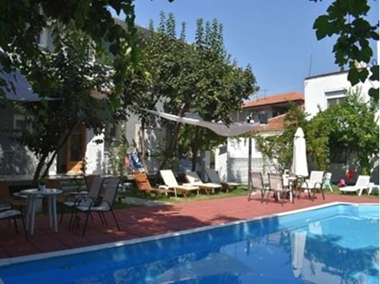 од градската плажа. Покрај одличната локација во мирно окружување, вилата има голем базен( без дел за деца) со лежалки и чадори (без доплата), мала рецепција со лоби, мало игралиште за деца, ѕидана скара која е на располагање на гостите и паркинг.