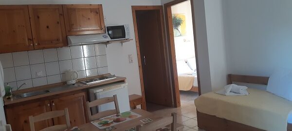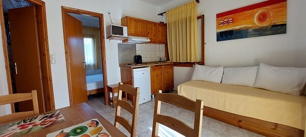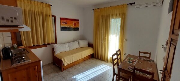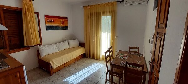 Апартманот се наоѓа на први кат и располага со две простории.Во првата просторија е кујната која е комплетно опремена со кујнски инвентар,мал фрижидер,шпорет со две рингли ,аспиратор,микробранова печка,чајник и има кревет на извлекување наменет за спиење на 2 лица.Овде има плакар за алишта и клима уред..Втората просторија е спланата соба во која има еден дупли кревет комотен за спиење на две лица, тв и сеф за лични работи.Од спалната се излегува на тераса со поглед во двор полн со зеленилo и поглед према море во далечина.Апартманот располага со стандардно купатило и WC со фен за коса.