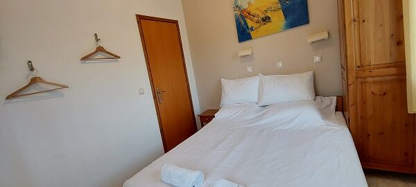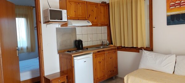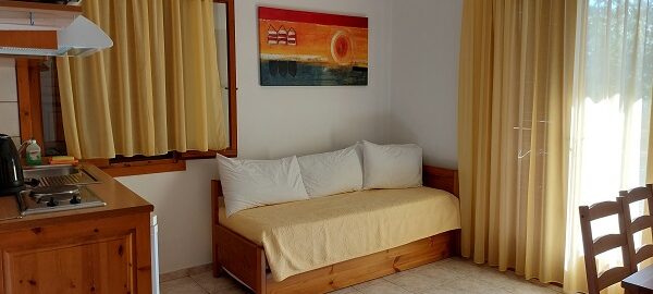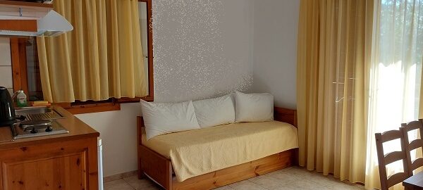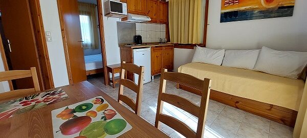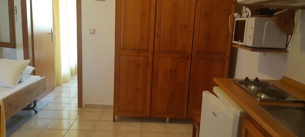 Апартманот се наоѓа на први кат и располага со две простории.Во првата просторија е кујната која е комплетно опремена со кујнски инвентар,мал фрижидер,шпорет со две рингли ,аспиратор,микробранова печка,чајник и има кревет на извлекување наменет за спиење на 2 лица.Овде има плакар за алишта и клима уред.Од оваа просторија се излегува на тераса со поглед во двор полн со зеленило.Втората просторија е спланата соба во која има еден дупли кревет комотен за спиење на две лица, тв и сеф за лични работи. Апартманот располага со стандардно купатило и WC со фен за коса.