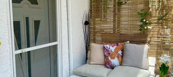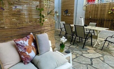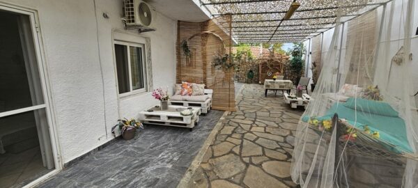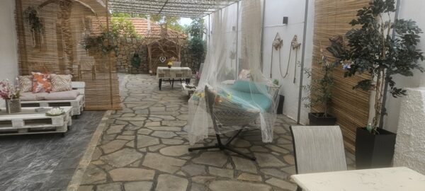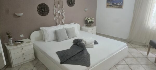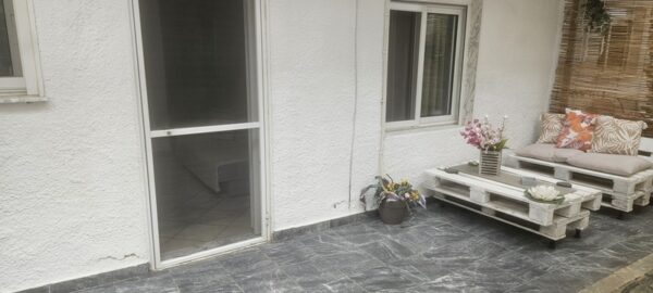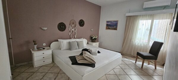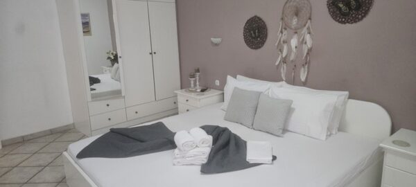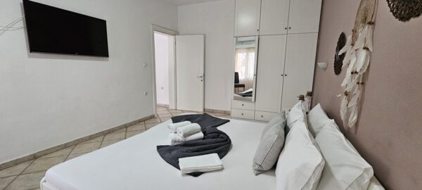 Апартманот се наоѓа на приземје и располага со две простории.Во првата просторија е кујната која е основно опремена со кујнски инвентар за лесни оброци без пржење,голем фрижидер,ел.шпорет со фурна, аспиратор,чајник и има кревет на спуштање наменет за спиење на 1 возрасен+1 дете.Втората просторија е спланата соба во која има еден дупли кревет комотен за спиење на две лица, тв, плакар за алишта и клима уред.Од апартманот се излегува на сопствен двор декоративно среден со маса и столици и полн со зеленило.Апартманот располага со стандардно купатило и WC.