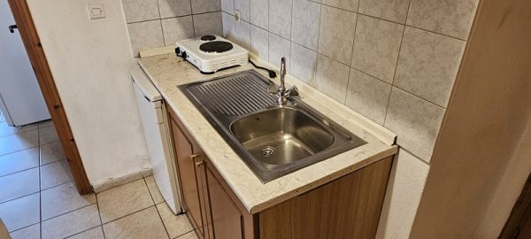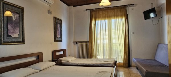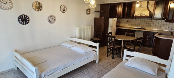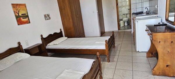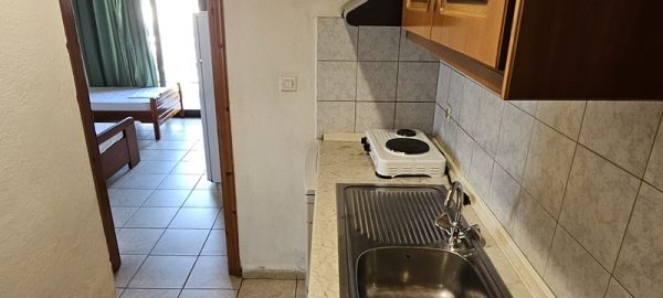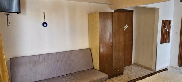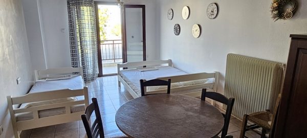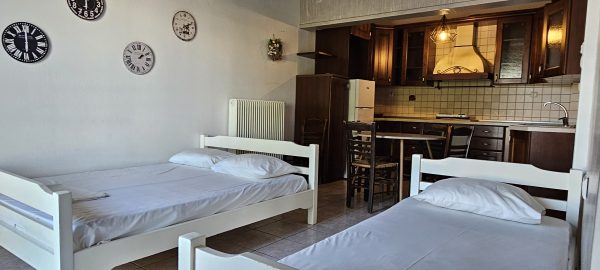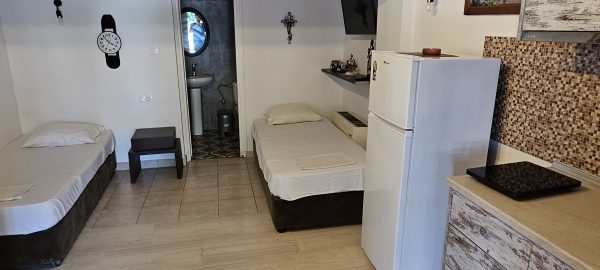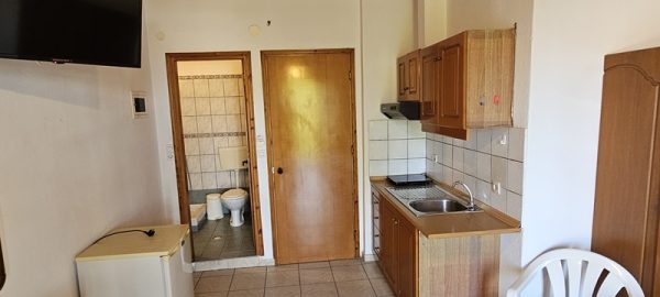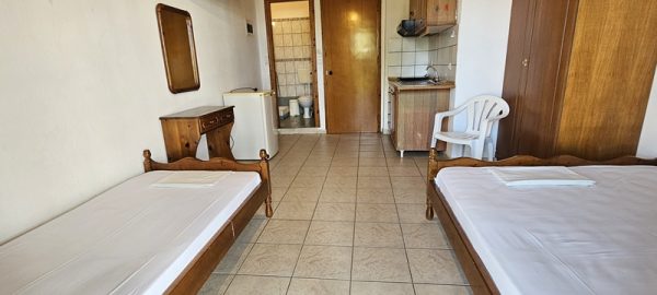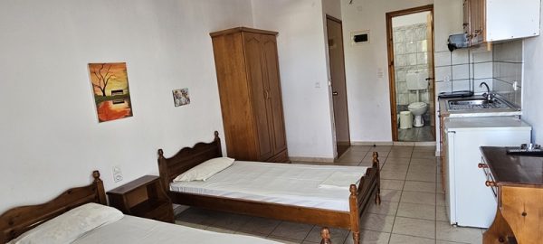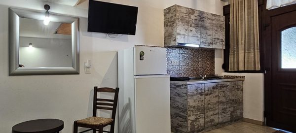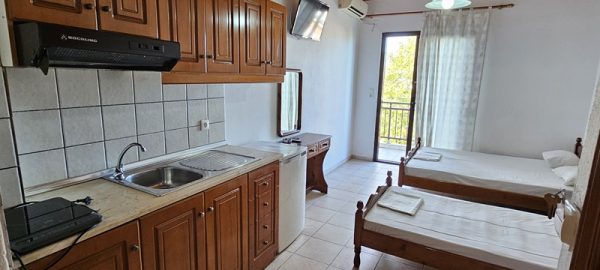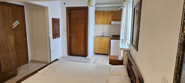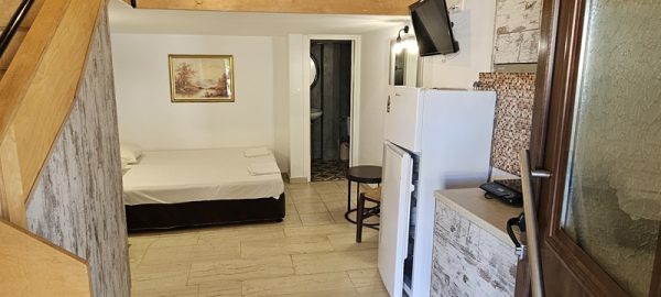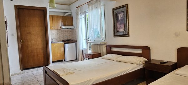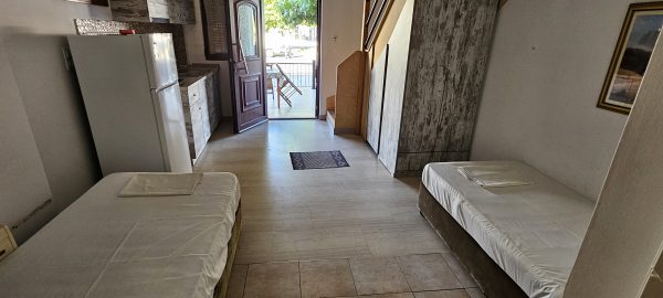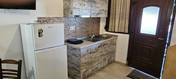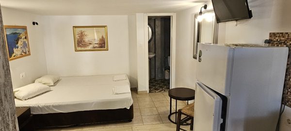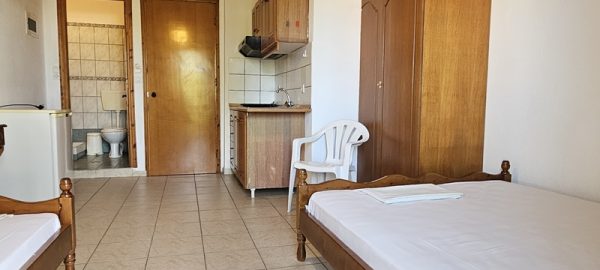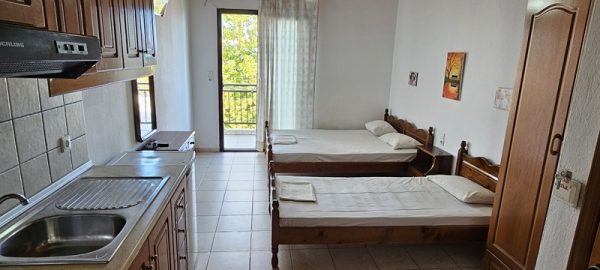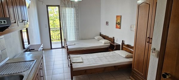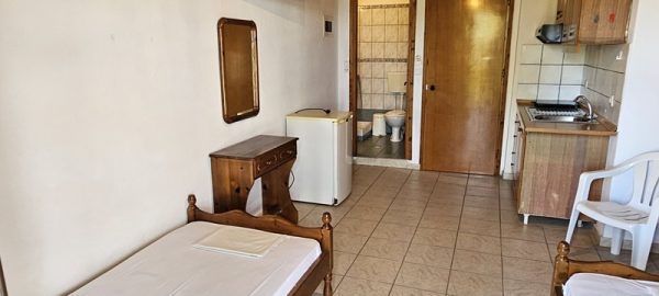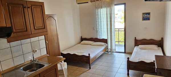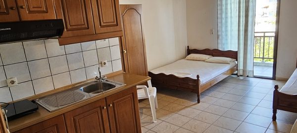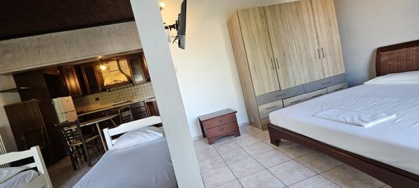 Студиото располага со еден дупол кревет,еден поединечен кревет и еден кревет на спуштање.Во сколопот на собата е кујната која е комплетно опремена со кујнски инвентар.Има решо со две рингли,аспиратор и фрижидер.Излегува на комотна тераса со маса и столици и има страничен поглед на море.Студиото има клима уред,тв и стандардно купатило со вц.
