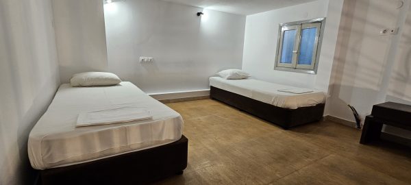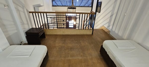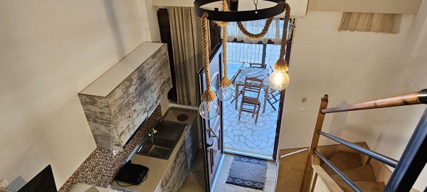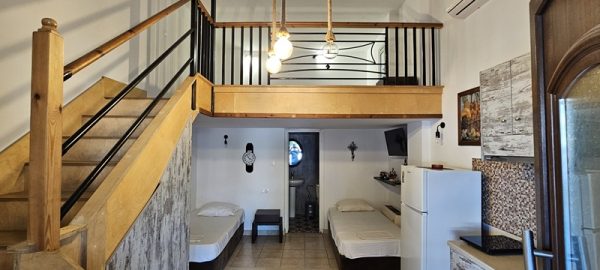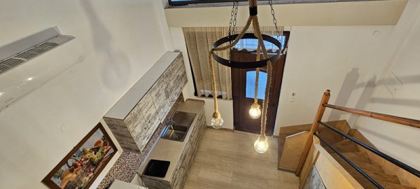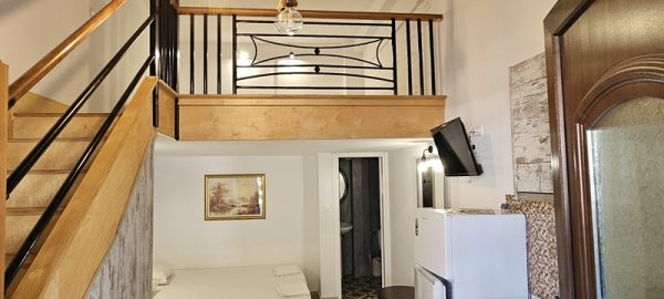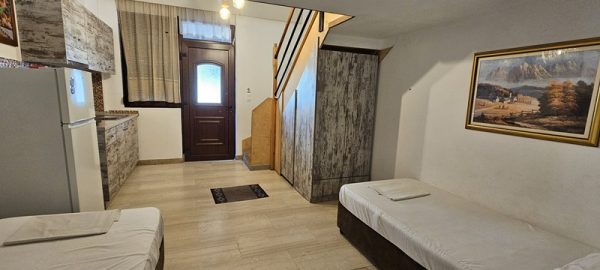 Располага со две спални соби кои се меѓусебно поврзани со внатрешни скали.На долниот кат во спалната соба е кујната која е комплетно опремена со кујнски инвентар,голем фрижидер,електрично решо,аспиратор +дворче .Во долната спална соба има два единечни кревети кои можат да се спојат како дупли кревет,плакар за алишта,клима уред,тв .Во другата спална соба која се наоѓа на вториот кат поврзана со внатрешни скали, има два единечни кревети. Апартман-мезонета има стандардно купатило со вц.