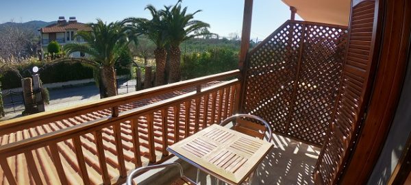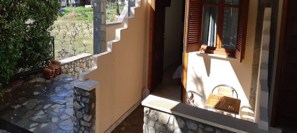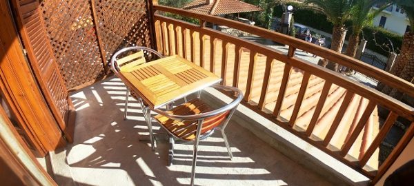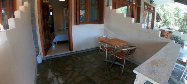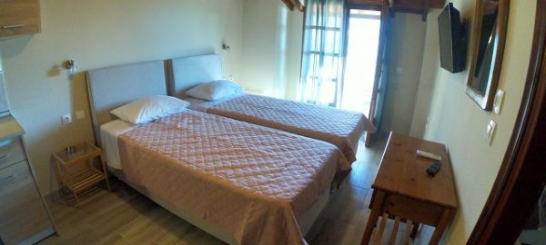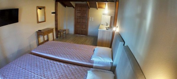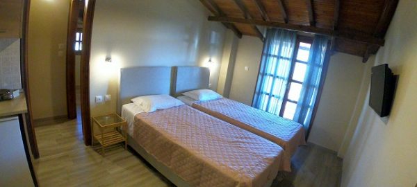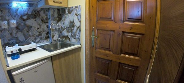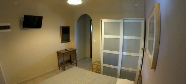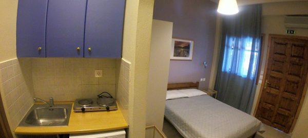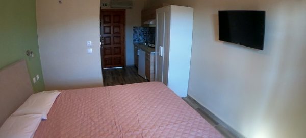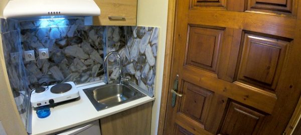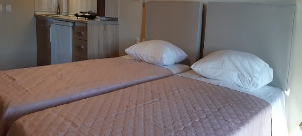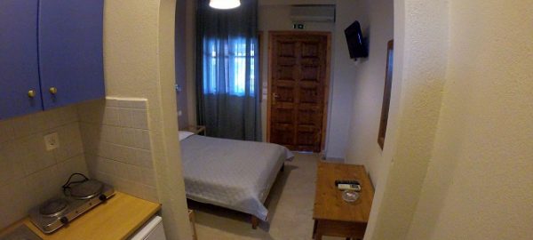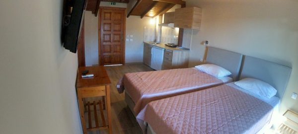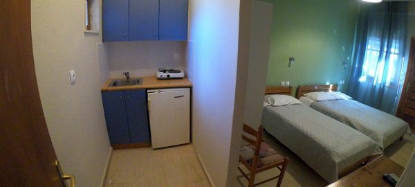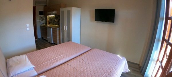Студиото располага со два поединечни кревети,има можност да се стави и доплнителено креветче на расклопување за дете до 06 год.,плакар за алишта, клима уред, тв. Во склоп на истата соба е и кујната , која е комплетно опремена со кујнски инвентар, фрижидер, аспиратор и решо. Студиото е опремено со стандардно купатило и вц. Од студиото се излегува на комотна тераса со маса и столици.