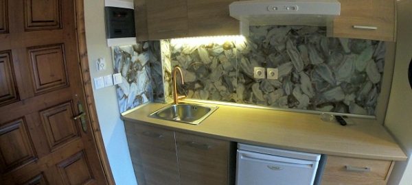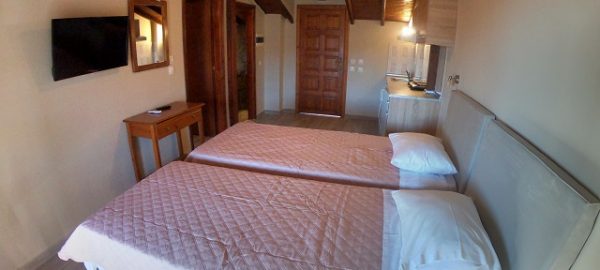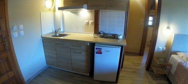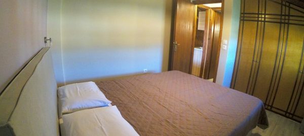 Апартманот располага со две простории.Во едната просторија е кујната која е комплетно опремена со кујнски инвентар, фрижидер, аспиратор и решо и овде има два поединечни кревети. Во другата просторија има дупол кревет клима уред и излегува на тераса. Апртманот има стандардно купатило и вц.