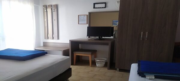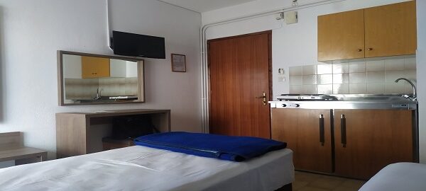 Студиото располага со еден дупол кревет стандарден за спиење за две лица и еден поединечен кревет стандарден за спиење за едно лице,плакар за алишта,тв, клима уред. Во склопот на истата соба има кујна комплетно опремена со кујнски инвентар,фрижидер ,решо со две рингли.Од собата се излегува на комотна тераса со маса и столици и има поглед на море.Студиото располага со стандардно купатило и вц.