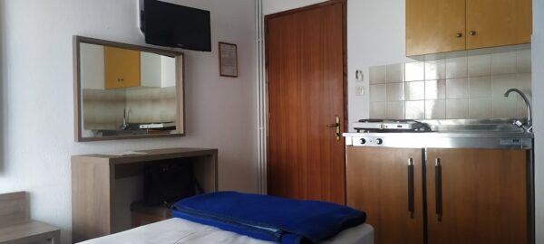 Студиото располага со еден дупол кревет стандарден за спиење за две лица и еден поединечен кревет стандарден за спиење за едно лице,плакар за алишта, тв, клима уред. Во склопот на истата соба има кујна комплетно опремена со кујнски инвентар,фрижидер ,решо со две рингли.Од собата се излегува на комотна тераса со маса и столици и има поглед на море.Студиото располага со стандардно купатило и вц.