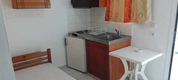 Апартманот располага со две простории. Првата просторија е кујната која е комплетно опремена со кујнски инвентар,решо со две рингли, аспиратор, фрижидер и има 1 поединечен кревет. Во втората просторија има 2 поединечни кревети со можност за дополнителен кревет, плакар за алишта, тв, клима и излегува на тераса на која има маса со столици и тенда, со поглед во убавата градина. Помеѓу двете простории нема врата. Има комарници и ролетни на прозорите .Апартманот располага со стандардно купатило и вц.
