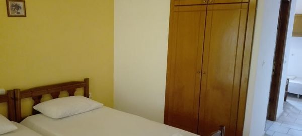 Апартманот располага со две простории. Првата просторија е кујната која е комплетно опремена со кујнски инвентар, решо со две рингли, аспиратор, фрижидер и има 1 поединечен кревет. Во втората просторија има 2 поединечни кревети, плакар за алишта, тв, клима и излегува на тераса на која има маса со столици и тенда, со поглед во убавата градина. Помеѓу двете простории нема врата. Има комарници и ролетни на прозорите .Апартманот располага со стандардно купатило и вц.
