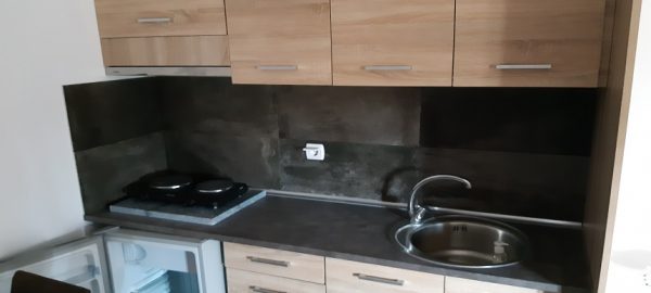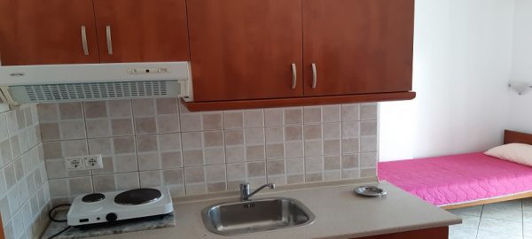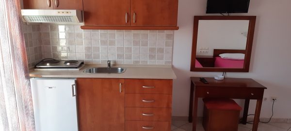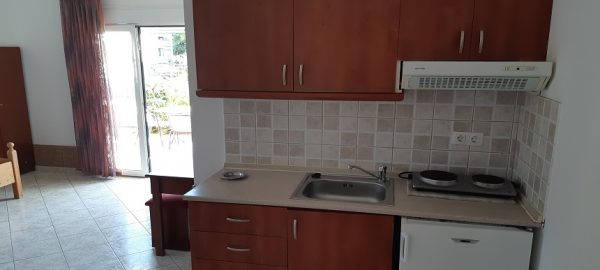 Располага со еден дупол кревет(француски) и еден поединечен кревет на спуштање, кујна опремена со кујнски инвентар,фрижидер,решо со две рингли , респиратор, плакар за алишта. Во собата има ТВ и клима уред.Има сопствено купатило и WC.Студиото излегува на сопствено дворче со маса и столици.