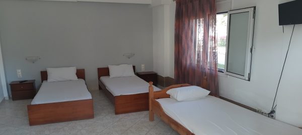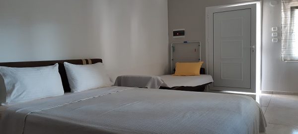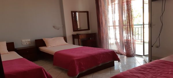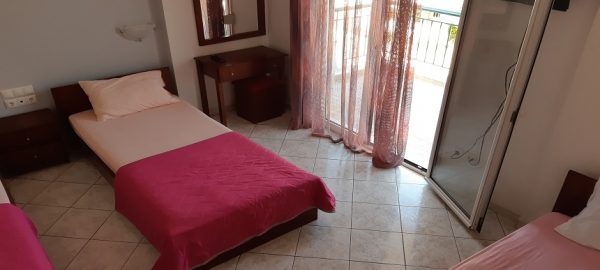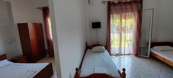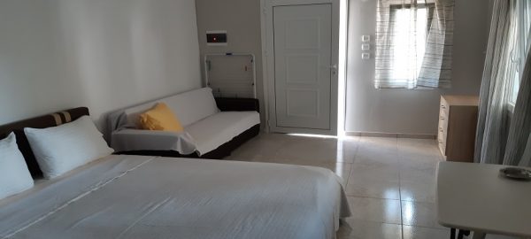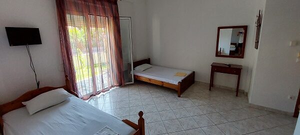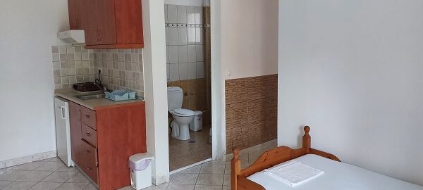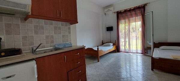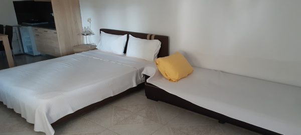 Располага со три поединечни кревети има простор за дополнителен кревет на расклопување(комотно е).Во склоп на собата има кујна опремена со кујнски инвентар,фрижидер,решо со две рингли, респиратор ,плакар за алишта.Во собата има ТВ и клима уред.Има сопствено купатило и WC.Студиото излегува на сопствено дворче со маса и столици.