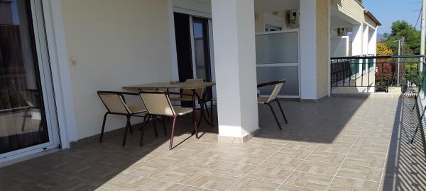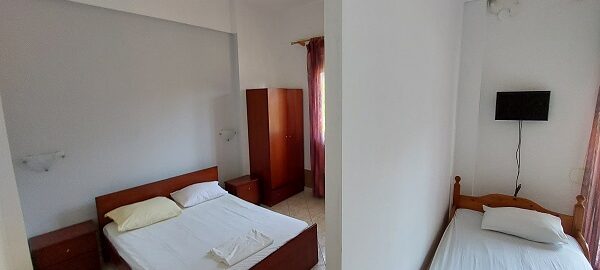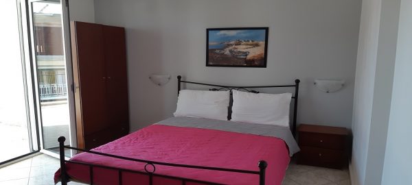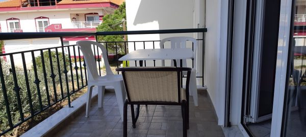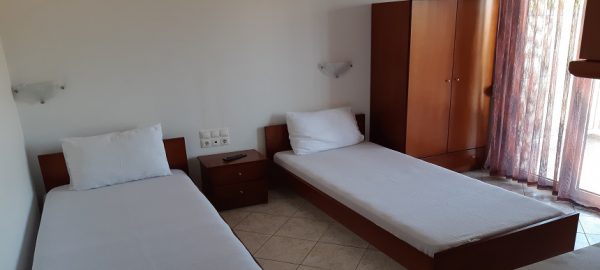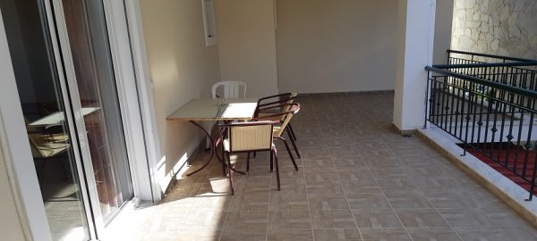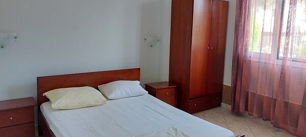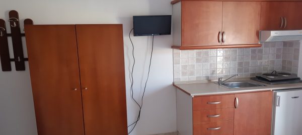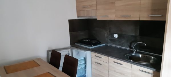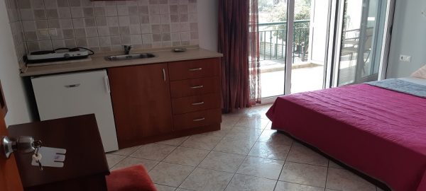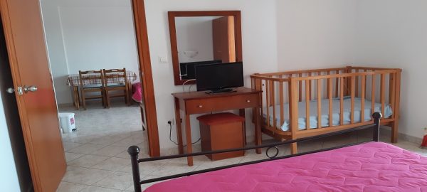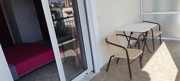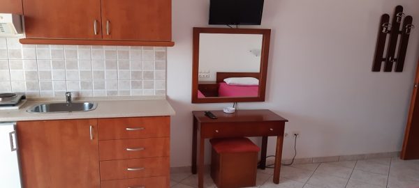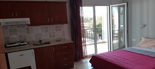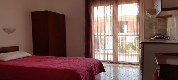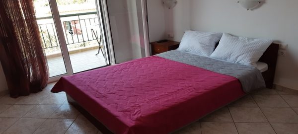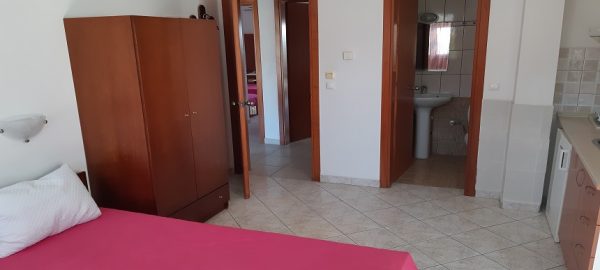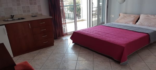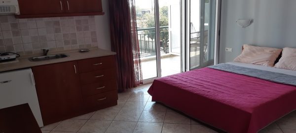 Во спалната има плакар за алишта, тв,клима уред и се излегува на тераса.Кујната е комплетно опремена со кујнски инвентар во која има фрижидер,решо со две рингли , респиратор.Има сопствено купатило и WC.Апартманот излегува на тераса со маса и столици.