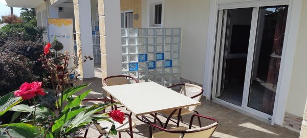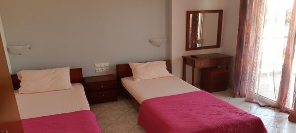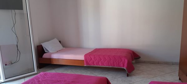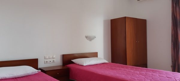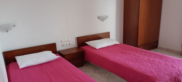 Апартманот располага со една спална, посебна кујна , купатило со WC и многу голема тераса 40М2 со маса и столици. Во спалната соба има еден дупол кревет и мало креветче за дете до 4 год.Од спалната се излегува на тераса.Во спалната е клима уредот ТВ и плакар за алишта.Во кујната има два поединечни кревети.Таа е комлетно опремена со кујнски инвентар,фрижидер,решо со две рингли,респиратор.И од кујната се излегува на тераса. Има сопствено купатило и WC.