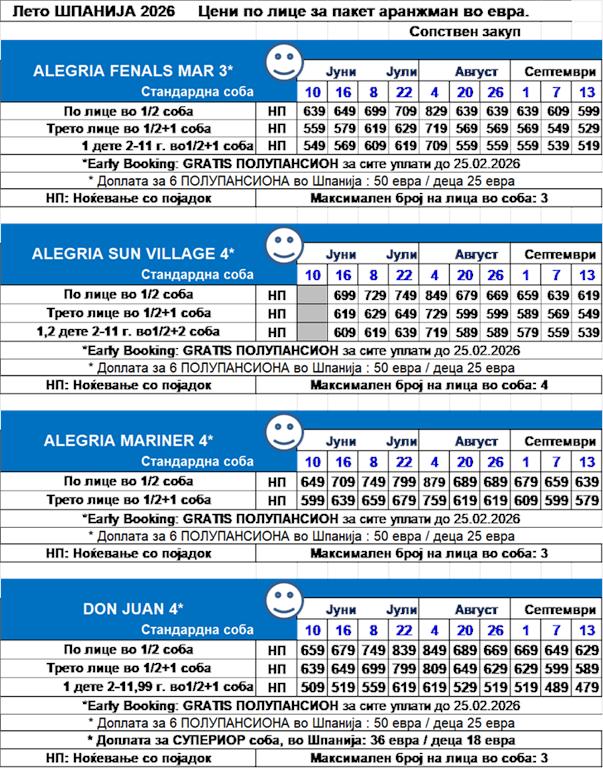 ЦЕНА за уплата до 25 Февруари 2026 + ГРАТИС ПОЛУПАНСИОН ВО ШПАНИЈА