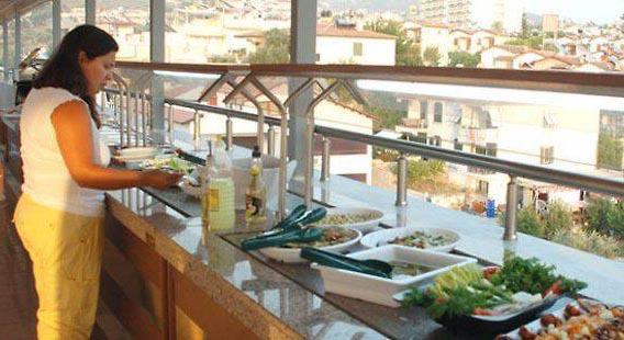 Услуга: Хотелот е на база HB(појадок и вечера – шведска маса – во главниот ресторан). Хотелот расолага со прекрасен ресторан на покривот во кој секојдневно се служат вкусни регионални и интернационални јадења. Хотелот исто така располага со два барови каде се служат топли,  безалкохолни и алкохолни пијалоци.